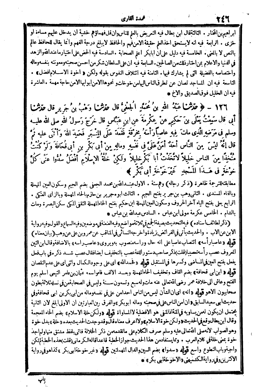 126 - (حَدثنَا عبد الله بن مُحَمَّد الْجعْفِيّ قَالَ حَدثنَا وهب بن جرير قَالَ حَدثنَا أبي قَالَ سَمِعت يعلى بن حَكِيم عَن عِكْرِمَة عَن ابْن عَبَّاس قَالَ خرج رَسُول الله - صَلَّى اللَّهُ عَلَيْهِ وَسَلَّم َ - فِي مَرضه الَّذِي مَاتَ فِيهِ عاصبا رَأسه بِخرقَة فَقعدَ على الْمِنْبَر فَحَمدَ الله وَأثْنى عَلَيْهِ ثمَّ قَالَ إِنَّه لَيْسَ من النَّاس أحد أَمن عَليّ فِي نَفسه وَمَاله من أبي بكر بن أبي قُحَافَة وَلَو كنت متخذا من النَّاس خَلِيلًا لاتخذت أَبَا بكر خَلِيلًا وَلَكِن خلة الْإِسْلَام أفضل سدوا عني كل خوخة فِي هَذَا الْمَسْجِد غير خوخة أبي بكر) مطابقته للتَّرْجَمَة ظَاهِرَة. (ذكر رِجَاله) وهم سِتَّة. الأول عبد الله بن مُحَمَّد الْجعْفِيّ بِضَم الْجِيم وَسُكُون الْعين الْمُهْملَة وبالفاء المسندي. الثَّانِي وهب بن جرير بِفَتْح الْجِيم. الثَّالِث أَبوهُ جرير بن حَازِم بِالْحَاء الْمُهْملَة وبالزاي الْعَتكِي. الرَّابِع يعلى بِفَتْح الْيَاء آخر الْحُرُوف وَسُكُون الْعين الْمُهْملَة ابْن حَكِيم بِفَتْح الْحَاء الْمُهْملَة الثَّقَفِيّ الْمَكِّيّ سكن الْبَصْرَة وَمَات بِالشَّام. الْخَامِس عِكْرِمَة مولى ابْن عَبَّاس. السَّادِس عبد الله بن عَبَّاس. (ذكر لطائف إِسْنَاده) فِيهِ التحديث بِصِيغَة الْجمع فِي ثَلَاثَة مَوَاضِع وَفِيه العنعنة فِي موضِعين وَفِيه السماع وَالْقَوْل وَفِيه رِوَايَة الابْن عَن الْأَب. والْحَدِيث يَأْتِي فِي الْفَرَائِض بِزِيَادَة وَأخرجه النَّسَائِيّ فِي المناقب عَن عَمْرو بن عَليّ عَن وهب. (بَيَان مَعْنَاهُ) قَوْله " عاصبا رَأسه " انتصاب عاصبا على أَنه حَال وَرَأسه مَنْصُوب بِهِ ويروى " عاصب رَأسه " بِالْإِضَافَة وَقَالَ ابْن التِّين الْمَعْرُوف عصب رَأسه تعصيبا (قلت) ذكر صَاحب دستور اللُّغَة عصب بِالتَّخْفِيفِ أَيْضا فَقَالَ عصب شدّ ذكره فِي بَاب فعل يفعل بِفَتْح الْعين فِي الْمَاضِي وَكسرهَا فِي الْمُسْتَقْبل قَوْله " فَحَمدَ الله " أَي على وجود الْكَمَال وَأثْنى أَي على عدم النُّقْصَان قَوْله " ابْن أبي قُحَافَة " بِضَم الْقَاف وَتَخْفِيف الْحَاء الْمُهْملَة وَبعد الْألف فَاء واسْمه عُثْمَان بن عَامر التَّيْمِيّ أسلم يَوْم الْفَتْح وعاش إِلَى خلَافَة عمر رَضِي الله تَعَالَى عَنهُ مَاتَ وَله سبع وَتسْعُونَ سنة وَلَيْسَ فِي الصَّحَابَة من فِي نَسْله ثَلَاثَة بطُون صحابيون إِلَّا هُوَ قَوْله " أَنه " أَي أَن الشَّأْن لَيْسَ من النَّاس أحدا من عَليّ فِي نَفسه وَمَاله من أبي بكر بن أبي قُحَافَة وَفِي حَدِيث أبي سعيد السَّابِق " أَن أَمن النَّاس عَليّ فِي صحبته وَمَاله أَبُو بكر " وَالْفرق بَين العبارتين أَن الأولى أبلغ لِأَن الثَّانِيَة يحْتَمل أَن يكون لَهُ من يُسَاوِيه فِي الْمِنَّة إِذْ الْمَنْفِيّ هُوَ الْأَفْضَلِيَّة لَا الْمُسَاوَاة قَوْله " وَلَكِن خلة الْإِسْلَام " بِضَم الْخَاء الْمُعْجَمَة وَقَالَ ابْن بطال وَقع فِي الحَدِيث " وَلَكِن خوة الْإِسْلَام " وَلَا أعرف مَعْنَاهُ قَالَ وَقد وجدت الحَدِيث بعده " خلة " بدل خوة وَهُوَ الصَّوَاب لِأَنَّهُ - صَلَّى اللَّهُ عَلَيْهِ وَسَلَّم َ - صرف الْكَلَام على مَا تقدمه من ذكر الخلالة فَأتى بِلَفْظ مُشْتَقّ مِنْهَا وَلم أجد خوة بِمَعْنى خلة فِي كَلَام الْعَرَب. وَمِمَّا يُسْتَفَاد من هَذَا الحَدِيث جَوَاز الْخطْبَة قَاعِدا قَالَه الْكرْمَانِي (قلت) هَذِه الْخطْبَة لم تكن وَاجِبَة وَبَاب التَّطَوُّع وَاسع قَوْله " سدوا " بِضَم السِّين وَالدَّال الْمُهْمَلَتَيْنِ قَوْله " غير خوخة أبي بكر " كَذَا هُوَ فِي رِوَايَة الْأَكْثَرين وَفِي رِوَايَة الْكشميهني " إِلَّا خوخة أبي بكر "