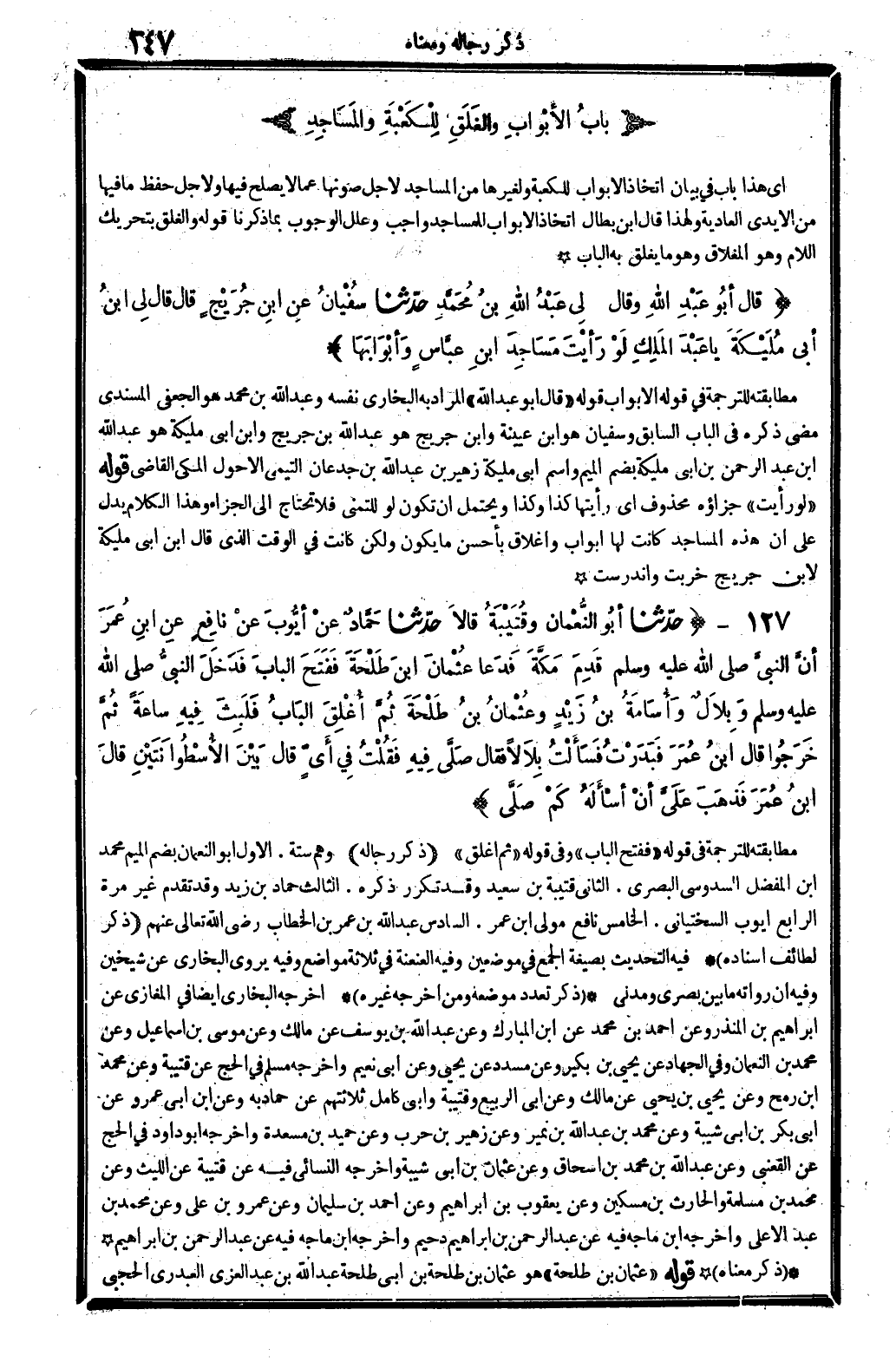 127 - (حَدثنَا أَبُو النُّعْمَان وقتيبة قَالَا حَدثنَا حَمَّاد عَن أَيُّوب عَن نَافِع عَن ابْن عمر أَن النَّبِي - صَلَّى اللَّهُ عَلَيْهِ وَسَلَّم َ - قدم مَكَّة فَدَعَا عُثْمَان بن طَلْحَة فَفتح الْبَاب فَدخل النَّبِي - صَلَّى اللَّهُ عَلَيْهِ وَسَلَّم َ - وبلال وَأُسَامَة بن زيد وَعُثْمَان بن طَلْحَة ثمَّ أغلق الْبَاب فَلبث فِيهِ سَاعَة ثمَّ خَرجُوا قَالَ ابْن عمر فبدرت فَسَأَلت بِلَالًا فَقَالَ صلى فِيهِ فَقلت فِي أَي قَالَ بَين الأسطوانتين قَالَ ابْن عمر فَذهب عَليّ أَن أسأله كم صلى) مطابقته للتَّرْجَمَة فِي قَوْله " فَفتح الْبَاب " وَفِي قَوْله " ثمَّ أغلق ". (ذكر رِجَاله) وهم سِتَّة. الأول أَبُو النُّعْمَان بِضَم الْمِيم مُحَمَّد بن الْمفضل السدُوسِي الْبَصْرِيّ. الثَّانِي قُتَيْبَة بن سعيد وَقد تكَرر ذكره. الثَّالِث حَمَّاد بن زيد وَقد تقدم غير مرّة. الرَّابِع أَيُّوب السّخْتِيَانِيّ. الْخَامِس نَافِع مولى ابْن عمر. السَّادِس عبد الله بن عمر بن الْخطاب رَضِي الله تَعَالَى عَنْهُم. (ذكر لطائف إِسْنَاده) فِيهِ التحديث بِصِيغَة الْجمع فِي موضِعين وَفِيه العنعنة فِي ثَلَاثَة مَوَاضِع وَفِيه روى البُخَارِيّ عَن شيخين وَفِيه أَن رُوَاته مَا بَين بَصرِي ومدني. (ذكر تعدد مَوْضِعه وَمن أخرجه غَيره) أخرجه البُخَارِيّ أَيْضا فِي الْمَغَازِي عَن إِبْرَاهِيم بن الْمُنْذر وَعَن أَحْمد بن مُحَمَّد عَن ابْن الْمُبَارك وَعَن عبد الله بن يُوسُف عَن مَالك وَعَن مُوسَى بن إِسْمَاعِيل وَعَن مُحَمَّد بن النُّعْمَان وَفِي الْجِهَاد عَن يحيى بن بكير وَعَن مُسَدّد عَن يحيى وَعَن أبي نعيم وَأخرجه مُسلم فِي الْحَج عَن قُتَيْبَة وَعَن مُحَمَّد بن رمح وَعَن يحيى بن يحيى عَن مَالك وَعَن أبي الرّبيع وقتيبة أبي كَامِل ثَلَاثَتهمْ عَن حَمَّاد بِهِ وَعَن ابْن أبي عَمْرو عَن أبي بكر بن أبي شيبَة وَعَن مُحَمَّد بن عبد الله بن نمير وَعَن زُهَيْر بن حَرْب وَعَن حميد بن مسْعدَة وَأخرجه أَبُو دَاوُد فِي الْحَج عَن القعْنبِي وَعَن عبد الله بن مُحَمَّد بن إِسْحَاق وَعَن عُثْمَان بن أبي شيبَة وَأخرجه النَّسَائِيّ فِيهِ عَن قُتَيْبَة عَن اللَّيْث وَعَن مُحَمَّد بن مسلمة والْحَارث بن مِسْكين وَعَن يَعْقُوب بن إِبْرَاهِيم وَعَن أَحْمد بن سُلَيْمَان وَعَن عَمْرو بن عَليّ وَعَن مُحَمَّد بن عبد الْأَعْلَى وَأخرجه ابْن مَاجَه فِيهِ عَن عبد الرَّحْمَن بن إِبْرَاهِيم دُحَيْم وَأخرجه ابْن مَاجَه فِيهِ عَن عبد الرَّحْمَن بن إِبْرَاهِيم (ذكر مَعْنَاهُ) قَوْله " عُثْمَان بن طَلْحَة " هُوَ عُثْمَان بن طَلْحَة بن أبي طَلْحَة عبد الله بن عبد الْعُزَّى الْعَبدَرِي الحَجبي