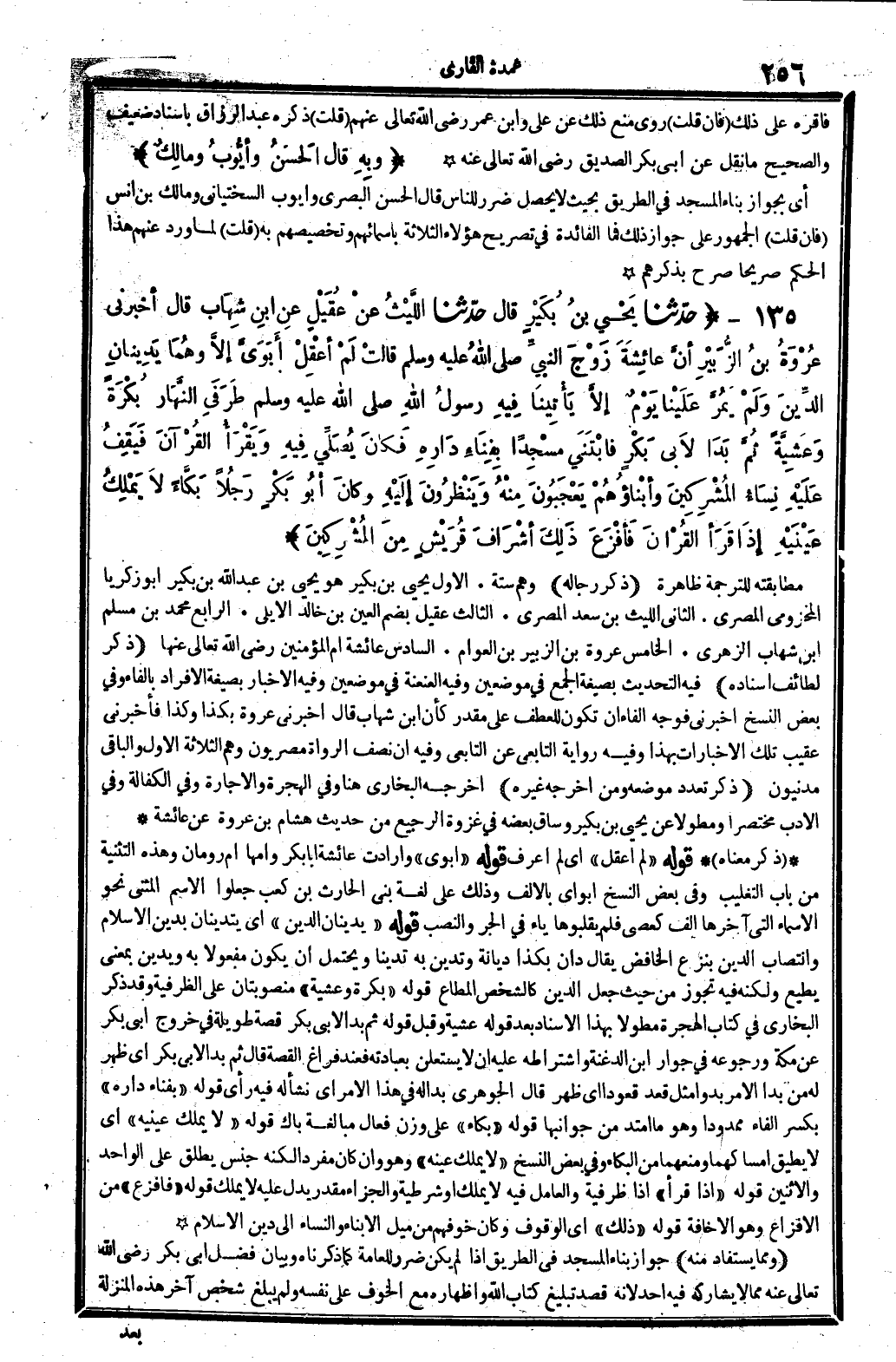 135 - (حَدثنَا يحيى بن بكير قَالَ حَدثنَا اللَّيْث عَن عقيل عَن ابْن شهَاب قَالَ أَخْبرنِي عُرْوَة بن الزبير أَن عَائِشَة زوج النَّبِي - صَلَّى اللَّهُ عَلَيْهِ وَسَلَّم َ - قَالَت لم أَعقل أَبَوي إِلَّا وهما يدينان الدّين وَلم يمر علينا يَوْم إِلَّا يأتينا فِيهِ رَسُول الله - صَلَّى اللَّهُ عَلَيْهِ وَسَلَّم َ - طرفِي النَّهَار بكرَة وَعَشِيَّة ثمَّ بدا لأبي بكر فابتنى مَسْجِدا بِفنَاء دَاره فَكَانَ يُصَلِّي فِيهِ وَيقْرَأ الْقُرْآن فيقف عَلَيْهِ نسَاء الْمُشْركين وأبناؤهم يعْجبُونَ مِنْهُ وَيَنْظُرُونَ إِلَيْهِ وَكَانَ أَبُو بكر رجلا بكاء لَا يملك عَيْنَيْهِ إِذا قَرَأَ الْقُرْآن فأفزغ ذَلِك أَشْرَاف قُرَيْش من الْمُشْركين) مطابقته للتَّرْجَمَة ظَاهِرَة. (ذكر رِجَاله) وهم سِتَّة. الأول يحيى بن بكير هُوَ يحيى بن عبد الله بن بكير أَبُو زَكَرِيَّا المَخْزُومِي الْمصْرِيّ. الثَّانِي اللَّيْث بن سعد الْمصْرِيّ. الثَّالِث عقيل بِضَم الْعين بن خَالِد الْأَيْلِي. الرَّابِع مُحَمَّد بن مُسلم بن شهَاب الزُّهْرِيّ. الْخَامِس عُرْوَة بن الزبير بن الْعَوام. السَّادِس عَائِشَة أم الْمُؤمنِينَ رَضِي الله تَعَالَى عَنْهَا. (ذكر لطائف إِسْنَاده) فِيهِ التحديث بِصِيغَة الْجمع فِي موضِعين وَفِيه العنعنة فِي موضِعين وَفِيه الْإِخْبَار بِصِيغَة الْإِفْرَاد بِالْفَاءِ وَفِي بعض النّسخ أَخْبرنِي فَوجه الْفَاء أَن تكون للْعَطْف على مُقَدّر كَأَن ابْن شهَاب قَالَ أَخْبرنِي عُرْوَة بِكَذَا وَكَذَا فَأَخْبرنِي عقيب تِلْكَ الإخبارات بِهَذَا وَفِيه رِوَايَة التَّابِعِيّ عَن التَّابِعِيّ وَفِيه أَن نصف الروَاة مصريون وهم الثَّلَاثَة الأول وَالْبَاقِي مدنيون. (ذكر تعدد مَوْضِعه وَمن أخرجه غَيره) أخرجه البُخَارِيّ هُنَا وَفِي الْهِجْرَة وَالْإِجَارَة وَفِي الْكفَالَة وَفِي الْأَدَب مُخْتَصرا وَمُطَولًا عَن يحيى بن بكير وسَاق بعضه فِي غَزْوَة الرجيع من حَدِيث هِشَام بن عُرْوَة عَن عَائِشَة (ذكر مَعْنَاهُ) قَوْله " لم أَعقل " أَي لم أعرف قَوْله " أَبَوي " وأرادت عَائِشَة أَبَا بكر وَأمّهَا أم رُومَان وَهَذِه التَّثْنِيَة من بَاب التغليب وَفِي بعض النّسخ أبواي بِالْألف وَذَلِكَ على لُغَة بني الْحَارِث بن كَعْب جعلُوا الِاسْم الْمثنى نَحْو الْأَسْمَاء الَّتِي آخرهَا ألف كعصى فَلم يقلبوها يَاء فِي الْجَرّ وَالنّصب قَوْله " يدينان الدّين " أَي يتدينان بدين الْإِسْلَام وانتصاب الدّين بِنَزْع الْخَافِض يُقَال دَان بِكَذَا ديانَة وَتَدين بِهِ تدينا وَيحْتَمل أَن يكون مَفْعُولا بِهِ ويدين بِمَعْنى يُطِيع وَلكنه فِيهِ تجوز من حَيْثُ جعل الدّين كالشخص المطاع قَوْله " بكرَة وَعَشِيَّة " منصوبتان على الظَّرْفِيَّة وَقد ذكر البُخَارِيّ فِي كتاب الْهِجْرَة مطولا بِهَذَا الْإِسْنَاد بعد قَوْله عَشِيَّة وَقبل قَوْله ثمَّ بدا لأبي بكر قصَّة طَوِيلَة فِي خُرُوج أبي بكر عَن مَكَّة ورجوعه فِي جوَار ابْن الدغنة واشتراطه عَلَيْهِ أَن لَا يستعلن بِعِبَادَتِهِ فَعِنْدَ فرَاغ الْقِصَّة قَالَ ثمَّ بدا لأبي بكر أَي ظهر لَهُ من بدا الْأَمر بدوا مثل قعد قعُودا أَي ظهر قَالَ الْجَوْهَرِي بدا لَهُ فِي هَذَا الْأَمر أَي نَشأ لَهُ فِيهِ رَأْي قَوْله " بِفنَاء دَاره " بِكَسْر الْفَاء ممدودا وَهُوَ مَا امْتَدَّ من جوانبها قَوْله " بكاء " على وزن فعال مُبَالغَة باك قَوْله " لَا يملك عَيْنَيْهِ " أَي لَا يُطيق إمساكهما ومنعهما من الْبكاء وَفِي بعض النّسخ " لَا يملك عينه " وَهُوَ وَإِن كَانَ مُفردا لكنه جنس يُطلق على الْوَاحِد والاثنين قَوْله " إِذا قَرَأَ " إِذا ظرفية وَالْعَامِل فِيهِ لَا يملك أَو شَرْطِيَّة وَالْجَزَاء مُقَدّر يدل عَلَيْهِ لَا يملك قَوْله " فأفزع " من الإفزاع وَهُوَ الإخافة قَوْله " ذَلِك " أَي الْوُقُوف وَكَانَ خوفهم من ميل الْأَبْنَاء وَالنِّسَاء إِلَى دين الْإِسْ