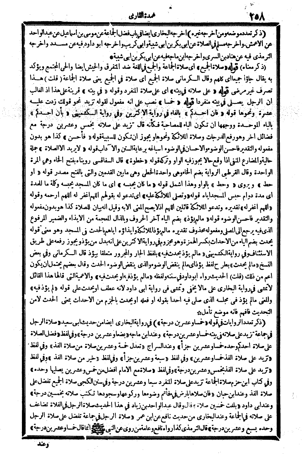 ذكر تعدد الرِّوَايَات فِي قَوْله: (خمْسا وَعشْرين دَرَجَة) فِي رِوَايَة البُخَارِيّ أَيْضا من حَدِيث أبي سعيد: (صَلَاة الرجل فِي جمَاعَة تزيد على صلَاته فِي بَيته خمْسا وَعشْرين دَرَجَة) . وَعند أبي ماجة: (بضعاً وَعشْرين دَرَجَة) ، وَفِي لفظ: (فضل الصَّلَاة على صَلَاة أحدكُم وَحده خمْسا وَعشْرين جُزْءا) . وَعند السراج: (تعدل خَمْسَة وَعشْرين صَلَاة من صَلَاة الْفَذ) ، وَفِي لفظ: (تزيد على صَلَاة الْفَذ خمْسا وَعشْرين) ، وَفِي لفظ: (سَبْعَة وَعشْرين جُزْءا) ، وَفِي لفظ: خير من صَلَاة الْفَذ) ، وَفِي لفظ: (تزيد على صَلَاة الْفَذ بِخمْس وَعشْرين دَرَجَة) ، وَفِي لفظ: (صَلَاة مَعَ الإِمَام أفضل من خمس وَعشْرين يُصليهَا وَحده) . وَفِي كتاب ابْن حزم: صَلَاة الْجَمَاعَة تزيد على صَلَاة الْمُنْفَرد سبعا وَعشْرين دَرَجَة، وَفِي (سنَن الْكَجِّي) : صَلَاة الْجَمِيع تفضل على صَلَاة الْفَذ، وَعند ابْن حبَان: (فَإِن صلاهَا بِأَرْض فَيْء فَأَتمَّ وضوءها وركوعها وسجودها تكْتب صلَاته بِخَمْسِينَ دَرَجَة) ، وَعند أبي دَاوُد: (بلغت خمسين صَلَاة) . وَقَالَ عبد الْوَاحِد بن زِيَاد فِي هَذَا الحَدِيث: صَلَاة الرجل فِي الفلاة، تضَاعف على صلَاته فِي الْجَمَاعَة، موعند البُخَارِيّ، من حَدِيث نَافِع عَن ابْن عمر: (صَلَاة الرجل فِي جمَاعَة تفضل على صَلَاة الرجل وَحده بِسبع وَعشْرين دَرَجَة) . قَالَ التِّرْمِذِيّ: كَذَا رَوَاهُ نَافِع، وَعَامة من روى عَن النَّبِي إِنَّمَا قَالَ: (خمْسا وَعشْرين دَرَجَة) ،