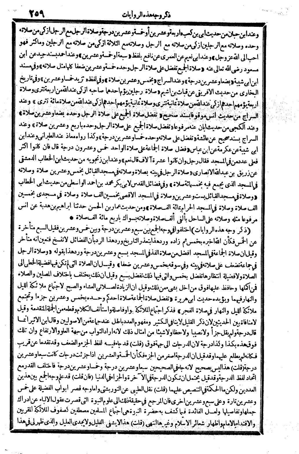 وَعند السراج: (بِخمْس وَعشْرين صَلَاة) ، وَفِي لفظ: (تزيد خمْسا وَعشْرين) ، وَفِي (تَارِيخ البُخَارِيّ) : من حَدِيث الإفْرِيقِي عَن قباث بن أَشْيَم: (صَلَاة رجلَيْنِ، يؤم أَحدهمَا صَاحبه، أذكى عِنْد امن أَرْبَعَة تترى، وَصَلَاة أَرْبَعَة يؤمهم أحدهم أذكى عِنْد امن صَلَاة ثَمَانِيَة تترى، وَصَلَاة ثَمَانِيَة يؤمهم أحدهم أذكى عِنْد امن صَلَاة مائَة تترى) ، وَعند السراج، من حَدِيث أنس مَوْقُوفا بِسَنَد صَحِيح: (تفضل صَلَاة الْجَمِيع على صَلَاة الرجل وَحده بضعاً وَعشْرين صَلَاة) . وَعند الْكَجِّي، من حَدِيث أبان مَرْفُوعا: (تفضل صَلَاة الْجَمِيع على صَلَاة الرجل وَحده بِأَرْبَع وَعشْرين صَلَاة) ، وَعند السراج بِسَنَد صَحِيح، وَعَن عَائِشَة: (تفضل على صلَاته وَحده خمْسا وَعشْرين دَرَجَة) ، وَكَذَا رَوَاهُ معَاذ عِنْد الطَّبَرَانِيّ، وَعند ابْن أبي شيبَة: عَن عِكْرِمَة عَن ابْن عَبَّاس: (فضل صَلَاة الْجَمَاعَة على صَلَاة الْوَاحِد خمس وَعِشْرُونَ دَرَجَة قَالَ، فَإِن كَانُوا أَكثر فعلى عدد من فِي الْمَسْجِد، فَقَالَ رجل: وَإِن كَانُوا عشرَة آلَاف؟ قَالَ: نعم) . وَعند ابْن زنجوية، من حَدِيث ابْن الْخطاب الدِّمَشْقِي: عَن زُرَيْق بن عبد االأنصاري: (صَلَاة الرجل فِي بَيته، وَصلَاته فِي مَسْجِد الْقَبَائِل بِخمْس وَعشْرين صَلَاة، وَصلَاته فِي الْمَسْجِد الَّذِي يجمع فِيهِ بِخَمْسِمِائَة صَلَاة) . وَفِي فَضَائِل الْقُدس لأبي بكر مُحَمَّد بن أَحْمد الوَاسِطِيّ، من حَدِيث أبي الْخطاب: (وَصَلَاة فِي مَسْجِد الْقَبَائِل بست وَعشْرين، وَصَلَاة فِي الْمَسْجِد الْأَقْصَى بِخَمْسِينَ ألف صَلَاة، وَصَلَاة فِي مَسْجِدي بِخَمْسِينَ ألف صَلَاة، وَصَلَاة فِي الْمَسْجِد الْحَرَام بِمِائَة ألف صَلَاة) . وَمن حَدِيث عمار بن الْحسن: حدّثنا إِبْرَاهِيم بن هدبة عَن أنس مَرْفُوعا مثله: وَصلَاته على السَّاحِل بألفي ألف صَلَاة، وَصلَاته بسواك بِأَرْبَع مائَة ألف صَلَاة.