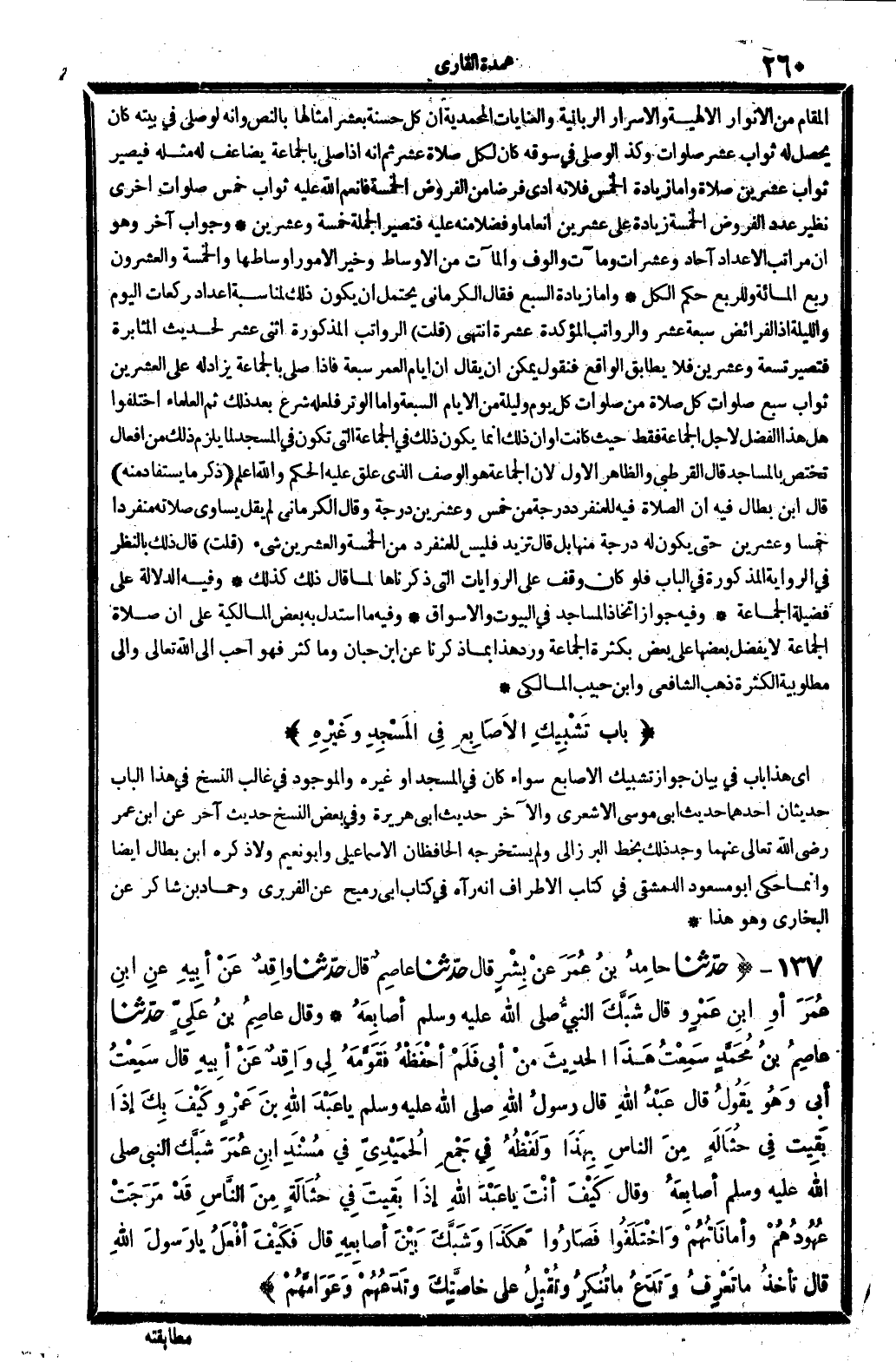 874731 - ح دّثنا حامِدُ بنُ عُمَرَ عنْ بَشْرٍ قَالَ حدّثنا عاصِمٌ قَالَ حدّثنا واقِدٌ عَنْ أبِيهِ عنِ ابنِ عُمَرَ أوِ ابنِ عَمْروٍ قَالَ شَبَّكَ النبيُّ أصَابِعَهُ. وَقَالَ عاصِمُ بنُ عَلِيٍ حدّثنا عاصِمُ بنُ مُحَمَّدٍ سَمِعْتُ هَذَا الحدِيثَ منْ أبي فَلَمْ أحْفَظْهُ فَقَوَّمَهُ لِي وَاقِدٌ عَنْ أبِيهِ قَالَ سَمِعْتُ أبي وَهُوَ يَقُولُ قَالَ عَبْدُ ااِ قَالَ رسولُ اللَّهِ يَا عَبْدَ ابنَ عَمْروٍ كَيْفَ بِكَ إذَا بَقِيت فِي حُثَالَةٍ مِنَ الناسِ بِهَذَا وَلَفْظُهُ فِي جَمْعِ الحُمَيْدِيّ فِي مْسْنَدِ ابنِ عُمَرَ شَبَّك النَّبِي أصَابِعَهُ وَقَالَ كَيْفَ أنْتَ يَا عَبْدَ ااِ إذَا بَقِيْتَ فِي حُثَالَةٍ مِنَ النَّاسِ قَدْ مَرَجَتْ عُهُودُهُمْ وأمانَاتُهُمْ وَاخْتَلَفُوا فَصَاروا هَكَذَا وَشَبَّكَ بَيْنَ أصابِعِهِ قَالَ فَكَيْفَ أفْعَلُ يَا رَسولَ ااِ قَالَ تأخذُ مَا تَعْرِفُ وَتَدَعُ مَا تُنكِرُ وتُقْبِلُ على خاصِتَّكَ وتَدَعُهُمْ وَعَوَامَّهُمْ. (انظرالحديث 974) .