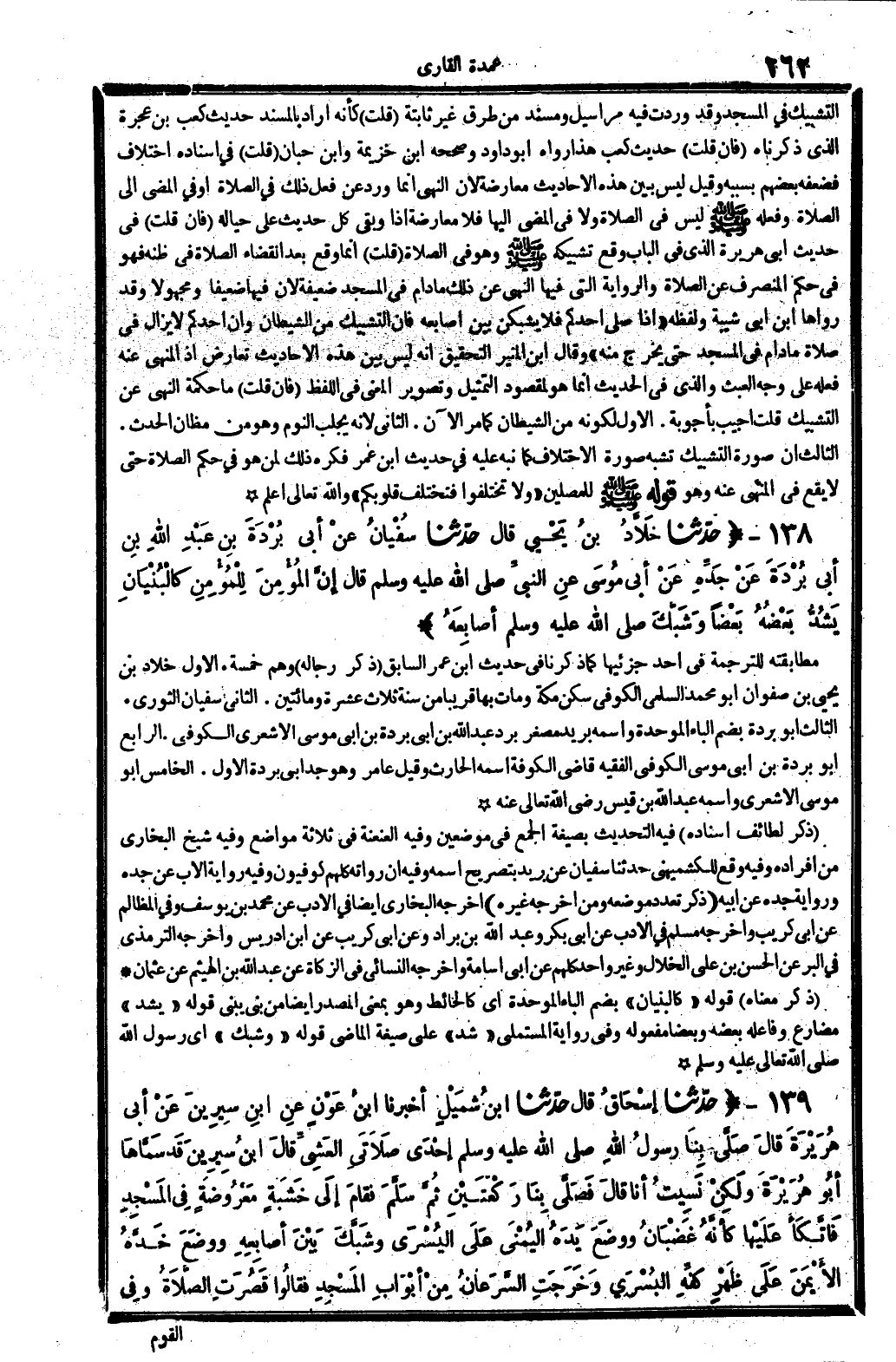 التشبيك فِي الْمَسْجِد، وَقد وَردت فِيهِ مَرَاسِيل، ومسند من طرق غير ثَابِتَة قلت: كَأَنَّهُ أَرَادَ بالمسند حَدِيث كَعْب بن عجْرَة الَّذِي ذَكرْنَاهُ فَإِن قلت: حَدِيث كَعْب هَذَا رَوَاهُ أَبُو دَاوُد وَصَححهُ ابْن خُزَيْمَة وَابْن حبَان قلت: فِي اسناده اخْتِلَاف، فضعفه بَعضهم بِسَبَبِهِ، وَقيل: لَيْسَ بَين هَذِه الْأَحَادِيث مُعَارضَة لِأَن النَّهْي إِنَّمَا ورد عَن فعل ذَلِك فِي الصَّلَاة أَو فِي الْمُضِيّ إِلَى الصَّلَاة وَفعله لَيْسَ فِي الصَّلَاة وَلَا فِي الْمُضِيّ إِلَيْهَا مُعَارضَة إِذا، وَبَقِي كل حَدِيث على حياله فَإِن قلت: فِي حَدِيث أبي هُرَيْرَة الَّذِي فِي الْبَاب وَقع تشبيكه وَهُوَ فِي الصَّلَاة قلت: إِنَّمَا بعد انْقِضَاء الصَّلَاة فِي ظَنّه فَهُوَ فِي حكم المنصرف عَن الصَّلَاة، وَالرِّوَايَة الَّتِي فِيهَا النَّهْي عَن ذَلِك مَا دَامَ فِي الْمَسْجِد ضعيفه، لِأَن فِيهَا ضَعِيفا ومجهولاً، وَقد رَوَاهَا ابْن أبي شيبَة، وَلَفظه: (إِذا صلى أحدكُم فَلَا يشبكن بَين أَصَابِعه، فَإِن التشبيك من الشَّيْطَان، وَإِن أحدكُم لَا يزَال فِي صَلَاة مَا دَامَ فِي الْمَسْجِد حَتَّى يخرج مِنْهُ) وَقَالَ ابْن الْمُنِير: التَّحْقِيق أَنه لَيْسَ بَين هَذِه الْأَحَادِيث تعَارض، إِذا الْمنْهِي عَنهُ فعله على وَجه الْعَبَث وَالَّذِي فِي الحَدِيث إِنَّمَا هُوَ الْمَقْصُود التَّمْثِيل وتصوير الْمَعْنى فِي اللَّفْظ فَإِن قلت: مَا حكمه النَّهْي عَن التشبيك؟ قلت: أُجِيب بأجوبة. الأول: لكَونه من الشَّيْطَان، كَمَا مر الْآن. الثَّانِي: لِأَنَّهُ يجلب النّوم، وَهُوَ من مظان الْحَدث. الثَّالِث: أَن صُورَة التشبيك تشبه صُورَة الِاخْتِلَاف، كَمَا نبه عَلَيْهِ فِي حَدِيث ابْن عمر، فكره ذَلِك لمن هُوَ فِي حكم الصَّلَاة حَتَّى لَا يَقع فِي الْمنْهِي عَنهُ. قَوْله: للمصلين: (وَلَا تختلفوا فتختلف قُلُوبهم) ، وَا تَعَالَى أعلم.