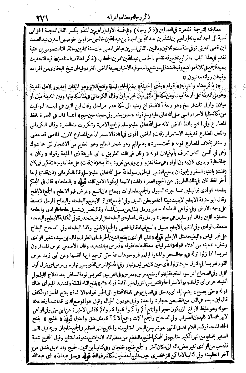 ذكر مَعْنَاهُ وَإِعْرَابه. قَوْله: (بِذِي الحليفة) ، بِضَم الْحَاء الْمُهْملَة وَفتح اللَّام وَهُوَ: الْمِيقَات الْمَشْهُور لأهل الْمَدِينَة، وَهُوَ من الْمَدِينَة على أَرْبَعَة أَمْيَال. وَمن مَكَّة على مِائَتي ميل غير ميلين. وَقَالَ الْكرْمَانِي فِي (مَنَاسِكه) بَينهَا وَبَين الْمَدِينَة ميل أَو ميلان، والميل ثلث فَرسَخ وَهُوَ أَرْبَعَة آلَاف ذِرَاع، وَمِنْهَا إِلَى مَكَّة عشر مراحل، وَقَالَ ابْن التِّين: هِيَ أبعد الْمَوَاقِيت من مَكَّة تَعْظِيمًا لإحرام النَّبِي،. قَوْله: (حِين يعْتَمر وَفِي حجَّته حِين حج) إِنَّمَا قَالَ فِي الْعمرَة بِلَفْظ الْمُضَارع، وَفِي الْحَج بِلَفْظ الْمَاضِي لِأَنَّهُ،، لم يحجّ إلاّ مرّة وتكررت مِنْهُ الْعمرَة؛ وَقَالَ الْكرْمَانِي: وَالْفِعْل الْمُضَارع قد يُفِيد الِاسْتِمْرَار. قلت: الْمَاضِي أقوى فِي إِفَادَة الِاسْتِمْرَار من الْمُضَارع، لِأَن الْمَاضِي قد مضى وَاسْتقر بِخِلَاف الْمُضَارع. قَوْله: (تَحت سَمُرَة) ، بِضَم الْمِيم: وَهُوَ شجر الطلح، وَهُوَ الْعَظِيم من الْأَشْجَار الَّتِي لَهَا شوك وَهِي فِي ألسن النَّاس تعرف بِأم غيلَان. قَوْله: (وَكَانَ فِي تِلْكَ الطَّرِيق) ، أَي: طَرِيق ذِي الحليفة. قَوْله: (وَكَانَ) ، جملَة حَالية، ويروى: كَانَ، بِدُونِ: الْوَاو، وَهِي صفة للغزو، ويروى: من غَزْوَة، بالتأنيث. فَإِن قلت: على هَذَا مَا وَجه التَّذْكِير فِي: كَانَ؟ قلت: بِاعْتِبَار السّفر، وَيجوز أَن يرجع الضَّمِير فِيهِ إِلَى رَسُول الله وَقَالَ الْكرْمَانِي: فَإِن قلت: لمَ مَا أخر لفظ: كَانَ، فِي تِلْكَ الطَّرِيق عَن الْحَج وَالْعمْرَة. قلت: لِأَنَّهُمَا لم يَكُونَا إِلَّا من تِلْكَ.