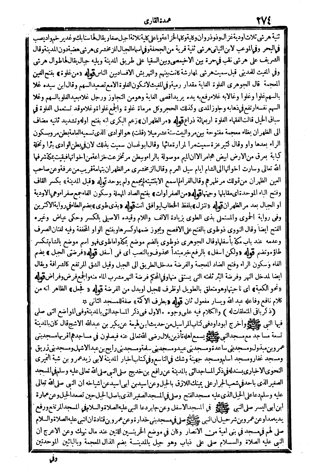 ذكر بَاقِي المتعلقات وَالْكَلَام فِيهِ على وُجُوه. الأول: فِي ذكر الْمَسَاجِد الَّتِي بِالْمَدِينَةِ، وَفِي الْمَوَاضِع الَّتِي صلى فِيهَا النَّبِي. وَأخرج أَبُو دَاوُد فِي (كتاب الْمَرَاسِيل) من حَدِيث ابْن لَهِيعَة: عَم بكير بن عبد االأشج قَالَ: كَانَ بِالْمَدِينَةِ تِسْعَة مَسَاجِد مَعَ مَسْجِد النَّبِي يسمع أَهله تأذين بِلَال، رَضِي اتعالى عَنهُ، فيصلون فِي مَسَاجِدهمْ أقربها مَسْجِد بني عَمْرو بن مبذول، وَمَسْجِد بني سَاعِدَة، وَمَسْجِد بني عبيد، وَمَسْجِد بني سَلمَة، وَمَسْجِد بني رَايِح بن عبد الْأَشْهَل، وَمَسْجِد بني زُرَيْق، وَمَسْجِد غفار، وَمَسْجِد أسلم، وَمَسْجِد جُهَيْنَة، وَشك فِي التَّاسِع. وَفِي كتاب (أَخْبَار الْمَدِينَة) لأبي زيد عَمْرو بن شبة النميري النَّحْوِيّ الأخباري، بِسَنَد لَهُ فِي ذكر الْمَسَاجِد الَّتِي بِالْمَدِينَةِ: عَن رَافع بن خديج: صلى النَّبِي، فِي الْمَسْجِد الصَّغِير الَّذِي بِأحد فِي شعب الجرار على يَمِينك اللازق بِالْجَبَلِ: وَعَن أسيد بن أبي أسيد عَن أشياخه أَن النَّبِي،، دَعَا على الْجَبَل الَّذِي عَلَيْهِ مَسْجِد الْفَتْح. وَصلى فِي الْمَسْجِد الصَّغِير الَّذِي بِأَصْل الْجَبَل حِين تصعد الْجَبَل: وَعَن عمَارَة ابْن أبي الْيُسْر: صلى النَّبِي فِي الْمَسْجِد الْأَسْفَل. وَعَن جَابر: دَعَا النَّبِي عَلَيْهِ الصَّلَاة وَالسَّلَام. فِي الْمَسْجِد الْمُرْتَفع وَرفع يَدَيْهِ مدا، وَعَن عَمْرو بن شُرَحْبِيل أَن النَّبِي صلى فِي مَسْجِد بني خدارة، وَعَن عَمْرو بن قَتَادَة أَن النَّبِي عَلَيْهِ الصَّلَاة وَالسَّلَام، صلى لَهُم فِي مَسْجِد فِي بني أُميَّة من الْأَنْصَار، وَكَانَ فِي مَوضِع الخربتين اللَّتَيْنِ عِنْد مَال نهيك. وَعَن الْأَعْرَج أَن النَّبِي عَلَيْهِ الصَّلَاة وَالسَّلَام، صلى على ذُبَاب وَهُوَ: جبل بِالْمَدِينَةِ، بِضَم الذَّال الْمُعْجَمَة وبالبائين الموحدتين،
