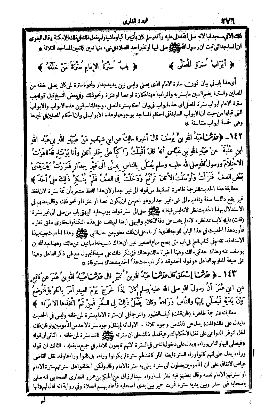 142 - (حَدثنَا عبد الله بن يُوسُف قَالَ أخبرنَا مَالك عَن ابْن شهَاب عَن عبيد الله بن عبد الله بن عتبَة عَن عبد الله بن عَبَّاس أَنه قَالَ أَقبلت رَاكِبًا على حمَار أتان وَأَنا يَوْمئِذٍ قد ناهزت الِاحْتِلَام وَرَسُول الله - صَلَّى اللَّهُ عَلَيْهِ وَسَلَّم َ - يُصَلِّي بِالنَّاسِ بمنى إِلَى غير جِدَار فمررت بَين يَدي بعض الصَّفّ فَنزلت وَأرْسلت الأتان ترتع وَدخلت فِي الصَّفّ فَلم يُنكر ذَلِك عَليّ أحد) مُطَابقَة هَذَا الحَدِيث للتَّرْجَمَة ظَاهِرَة تستنبط من قَوْله إِلَى غير جِدَار لِأَن هَذَا اللَّفْظ مشْعر بِأَن ثمَّة ستْرَة لِأَن لفظ غير يَقع دَائِما صفة وَتَقْدِيره إِلَى شَيْء غير جِدَار وَهُوَ أَعم من أَن يكون عَصا أَو عنزة أَو نَحْو ذَلِك وَقَالَ بَعضهم فِي الِاسْتِدْلَال بِهَذَا الحَدِيث نظر لِأَنَّهُ لَيْسَ فِيهِ أَنه - صَلَّى اللَّهُ عَلَيْهِ وَسَلَّم َ - صلى إِلَى ستْرَة وَقد بوب عَلَيْهِ الْبَيْهَقِيّ بَاب من صلى إِلَى غير ستْرَة (قلت) دَلِيله لَا يساعد نظره لِأَنَّهُ لم يقف على دقة الْكَلَام وَالْبَيْهَقِيّ أَيْضا لم يقف على هَذِه النُّكْتَة وَالْبُخَارِيّ دقق نظره فأورد هَذَا الحَدِيث فِي هَذَا الْبَاب للْوَجْه الَّذِي ذَكرْنَاهُ على أَن ذَلِك مَعْلُوم من حَال النَّبِي - صَلَّى اللَّهُ عَلَيْهِ وَسَلَّم َ - وَهَذَا الحَدِيث بِعَيْنِه بِهَذَا الْإِسْنَاد قد تقدم فِي كتاب الْعلم فِي بَاب مَتى يَصح سَماع الصَّغِير غير أَن هُنَاكَ شَيْخه إِسْمَاعِيل عَن مَالك وَهَهُنَا عبد الله بن يُوسُف عَنهُ وَهُنَاكَ حَدثنِي مَالك وَهَهُنَا أخبرنَا مَالك وَهُنَاكَ فَلم يُنكر ذَلِك على صِيغَة الْمَجْهُول مَعَ طي ذكر الْفَاعِل وَهَهُنَا على صِيغَة الْمَعْلُوم وَالْفَاعِل هُوَ قَوْله أحد وَقد ذكرنَا مبَاحث هَذَا الحَدِيث هُنَاكَ مستوفاة