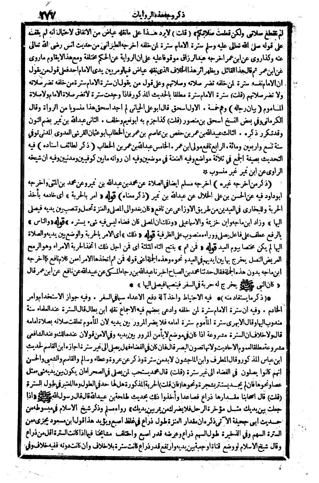 لم تقطع صَلَاتي وَلَكِن قطعت صَلَاتكُمْ " (قلت) لَا يرد هَذَا على مَا نَقله عِيَاض من الِاتِّفَاق لاحْتِمَال أَنه لم يقف على قَوْله - صَلَّى اللَّهُ عَلَيْهِ وَسَلَّم َ - ستْرَة الإِمَام ستْرَة لمن خَلفه أخرجه الطَّبَرَانِيّ من حَدِيث أنس رَضِي الله تَعَالَى عَنهُ وَكَذَا روى عَن ابْن عمر أخرجه عبد الرَّزَّاق مَوْقُوفا عَلَيْهِ على أَن الرِّوَايَة عَن الحكم مُخْتَلفَة وَمَعَ هَذَا لَا يُقَاوم مَا رُوِيَ عَن ابْن عمر ثمَّ قَالَ هَذَا الْقَائِل وَيظْهر أثر هَذَا الْخلاف الَّذِي نَقله عِيَاض فِيمَا لَو مر بَين يَدي الإِمَام أحد فعلى قَول من يَقُول أَن الإِمَام نَفسه ستْرَة لمن خَلفه تضر صلَاته وصلاتهم وعَلى قَول من يَقُول أَن ستْرَة الإِمَام ستْرَة من خَلفه تضر صلَاته وَلَا تضر صلَاتهم (قلت) ستْرَة الإِمَام ستْرَة مُطلقًا بِالْحَدِيثِ الْمَذْكُور فَإِذا وجدت ستْرَة لَا تضر صَلَاة الإِمَام وَلَا صَلَاة الْمَأْمُوم. (بَيَان رِجَاله) وهم خَمْسَة. الأول اسحق قَالَ أَبُو عَليّ الجياني لم أجد اسحق هَذَا مَنْسُوبا من الروَاة وَقَالَ الْكرْمَانِي وَفِي بعض النّسخ اسحق بن مَنْصُور (قلت) كَذَا جزم بِهِ أَبُو نعيم وَخلف. الثَّانِي عبد الله بن نمير بِضَم النُّون وَقد تكَرر ذكره. الثَّالِث عبيد الله بن عمر بن حَفْص بن عَاصِم بن عمر بن الْخطاب أَبُو عُثْمَان الْقرشِي الْعَدوي الْمدنِي توفّي سنة تسع وَأَرْبَعين وَمِائَة. الرَّابِع نَافِع مولى ابْن عمر. الْخَامِس عبد الله بن عمر بن الْخطاب. (ذكر لطائف إِسْنَاده) فِيهِ التحديث بِصِيغَة الْجمع فِي ثَلَاثَة مَوَاضِع وَفِيه العنعنة فِي موضِعين وَفِيه أَن رُوَاته مَا بَين كوفيين ومدنيين وَفِيه أَن شَيْخه الرَّاوِي عَن ابْن نمير غير مَنْسُوب (ذكر من أخرجه غَيره) أخرجه مُسلم أَيْضا فِي الصَّلَاة عَن مُحَمَّد بن عبد الله بن نمير وَعَن مُحَمَّد بن الْمثنى وَأخرجه أَبُو دَاوُد فِيهِ عَن الْحسن بن عَليّ الْخلال عَن عبد الله بن نمير. (ذكر مَعْنَاهُ) قَوْله " أَمر بالحربة " أَي خادمه بِأخذ الحربة وللبخاري فِي الْعِيدَيْنِ من طَرِيق الْأَوْزَاعِيّ عَن نَافِع " كَانَ يَغْدُو إِلَى الْمصلى والعنزة تحمل وتنصب بَين يَدَيْهِ فَيصَلي إِلَيْهَا " وَزَاد ابْن مَاجَه وَابْن خُزَيْمَة والإسماعيلي " وَذَلِكَ أَن الْمصلى كَانَ فضاء لَيْسَ فِيهِ شَيْء يستره " قَوْله " وَالنَّاس " بِالرَّفْع عطف على فَاعل يُصَلِّي ووراءه مَنْصُوب على الظَّرْفِيَّة قَوْله " ذَلِك " أَي الْأَمر بالحربة والوضع بَين يَدَيْهِ وَالصَّلَاة إِلَيْهَا لم يكن مُخْتَصًّا بِيَوْم الْعِيد قَوْله " فَمن ثمَّ " بِفَتْح الثَّاء الْمُثَلَّثَة أَي فَمن أجل ذَلِك اتخذ الحربة الْأُمَرَاء وَهُوَ الرمْح العريض النصل يخرج بهَا بَين أَيْديهم فِي الْعِيد وَنَحْوه وَهَذِه الْجُمْلَة أَعنِي قَوْله فَمن ثمَّ اتخذها الْأُمَرَاء من كَلَام نَافِع كَمَا أخرجه ابْن مَاجَه بِدُونِ هَذِه الْجُمْلَة فَقَالَ حَدثنَا مُحَمَّد بن الصَّباح أخبرنَا عبد الله بن رَجَاء الْمَكِّيّ عَن عبيد الله عَن نَافِع عَن ابْن عمر قَالَ " كَانَ النَّبِي - صَلَّى اللَّهُ عَلَيْهِ وَسَلَّم َ - يخرج لَهُ حَرْبَة فِي السّفر فينصبها فَيصَلي إِلَيْهَا " (ذكر مَا يُسْتَفَاد مِنْهُ) فِيهِ الِاحْتِيَاط وَأخذ آلَة دفع الْأَعْدَاء سِيمَا فِي السّفر. وَفِيه جَوَاز الِاسْتِخْدَام وَأمر الْخَادِم. وَفِيه أَنه ستْرَة الإِمَام ستْرَة لمن خَلفه وَادّعى بَعضهم فِيهِ الْإِجْمَاع نَقله ابْن بطال قَالَ الستْرَة عِنْد الْعلمَاء سنة مَنْدُوب إِلَيْهَا وَقَالَ الْأَبْهَرِيّ ستْرَة الْمَأْمُوم ستْرَة إِمَامه فَلَا يضر الْمُرُور بَين يَدَيْهِ لِأَن الْمَأْمُوم تعلّقت صلَاته بِصَلَاة إِمَامه قَالَ وَلَا خلاف أَنه الستْرَة مَشْرُوعَة إِذا كَانَ فِي مَوضِع لَا يَأْمَن الْمُرُور بَين يَدَيْهِ وَفِي الْأَمْن قَولَان