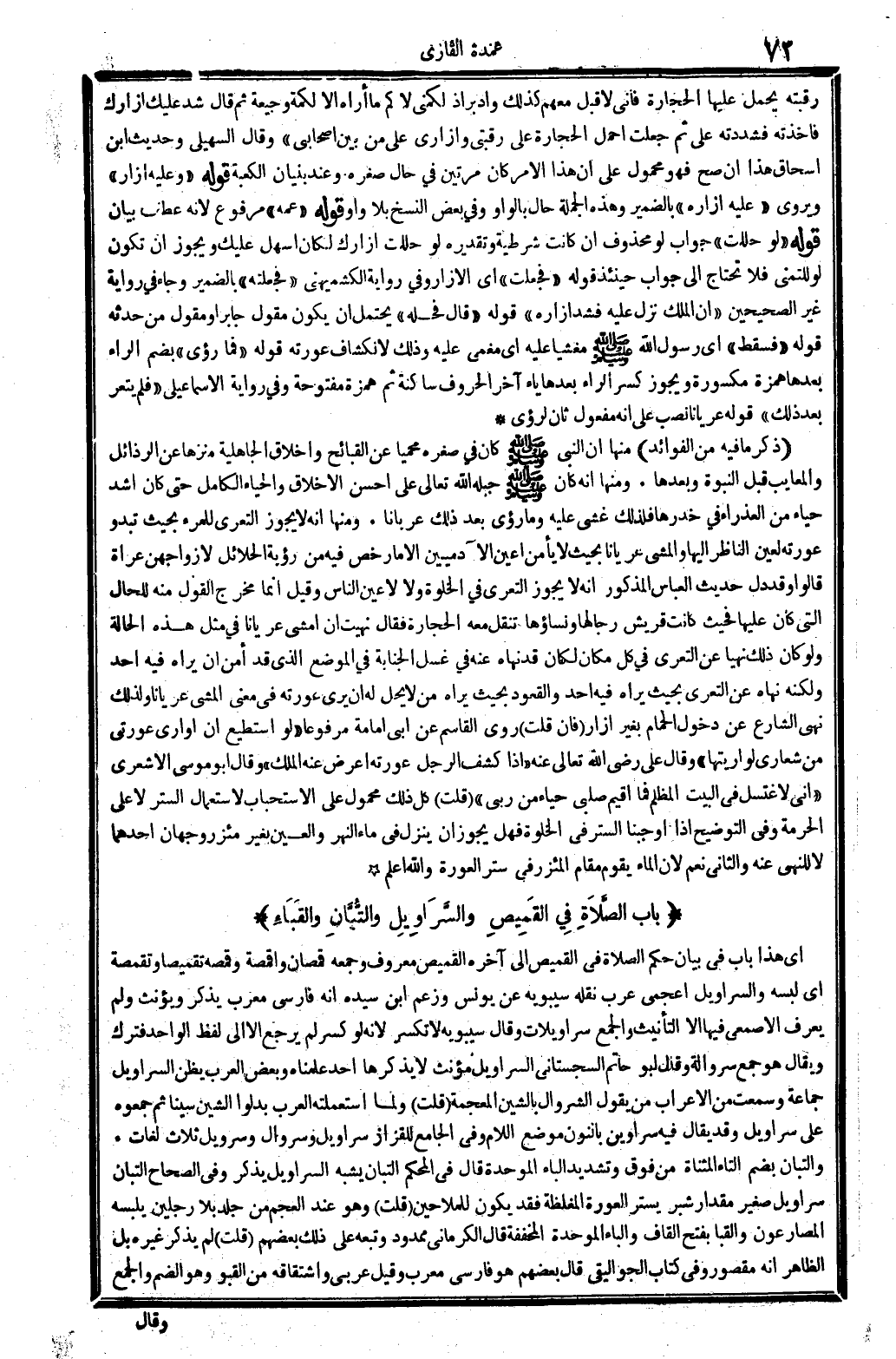 أَي: هَذَا بَاب فِي بَيَان حكم الصَّلَاة فِي الْقَمِيص إِلَى آخِره. الْقَمِيص مَعْرُوف، وَجمعه: قمصان وأقمصة، وقمصه تقميصاً وتقمصة أَي؛ لبسه: والسراويل أعجمي عرّب، نقل سِيبَوَيْهٍ عَن يُونُس، وَزعم ابْن سَيّده أَنه فَارسي مُعرب يذكر وَيُؤَنث، وَلم يعرف الْأَصْمَعِي فِيهَا إِلَّا التَّأْنِيث، وَالْجمع سراويلات، وَقَالَ سِيبَوَيْهٍ: لَا تكسر لِأَنَّهُ لَو كسر لم يرجع إلاَّ إِلَى لفظ الْوَاحِد فَترك. وَيُقَال. هُوَ جمع سروالة. وَقَالَ أَبُو حَاتِم السجسْتانِي: السَّرَاوِيل، مؤنث لَا يذكرهَا أحد علمناه، وَبَعض الْعَرَب يظنّ السَّرَاوِيل جمَاعَة، وَسمعت من الْأَعْرَاب من يَقُول: الشروال بالشين الْمُعْجَمَة. قلت: وَلما استعملته الْعَرَب بدلُوا الشين سيناً ثمَّ جَمَعُوهُ على سَرَاوِيل، وَقد يُقَال فِيهِ: سراوين، بالنُّون مَوضِع اللَّام، وَفِي (الْجَامِع) للقزاز: سَرَاوِيل وسروال وسرويل، ثَلَاث لُغَات. والتبان، بِضَم التَّاء الْمُثَنَّاة من فَوق وَتَشْديد الْبَاء الْمُوَحدَة. قَالَ فِي (الْمُحكم) : التبَّان يشبه السَّرَاوِيل يذكر. وَفِي (الصِّحَاح) : التبَّان سَرَاوِيل صَغِير مِقْدَار شبر يستر الْعَوْرَة الْمُغَلَّظَة، فقد يكون للملاحين. قلت: وَهُوَ عِنْد الْعَجم من جلد بِلَا رجلَيْنِ يلْبسهُ المصارعون. والقبا، بِفَتْح الْقَاف وَالْبَاء الْمُوَحدَة المخففة. قَالَ الْكرْمَانِي: مَمْدُود، وَتَبعهُ على ذَلِك بَعضهم. قلت: لم يذكر غَيره، بل الظَّاهِر أَنه مَقْصُور. وَفِي كتاب الجواليقي: قَالَ بَعضهم: هُوَ فَارسي مُعرب، وَقيل: عَرَبِيّ واشتقاقه من: القبو، وَهُوَ الضَّم وَالْجمع