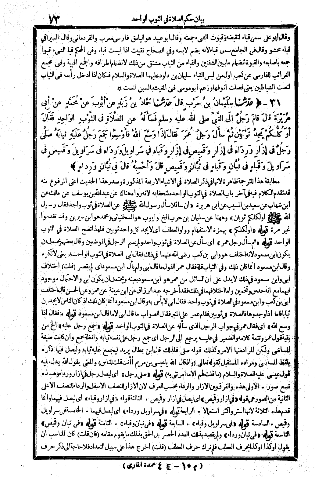 563 - ح دّثنا سُلَيْمَانُ بنُ حَرْبٍ قالَ حدّثنا حَمَّادُ بنُ زَيْدٍ عنْ أيُّوبَ عنْ مُحَمَّدٍ عنْ أبِي هُرَيْرَةَ قالَ قامَ رَجُلٌ إِلَى النَّبيِّ فَسَأَلَهُ عنِ الصَّلاَةِ فِي الثَّوْبِ الوَاحِدِ فَقَالَ أَوَ كُلُّكُمْ يَجِدُ ثَوْبَيْنِ ثُمَّ سأَلَ رَجُلٌ عُمَرَ فَقالَ إذَا وَسَّعَ اللَّهُ فَأَوْسِعُوا جَمَعَ رَجُلٌ عَلَيْهِ ثيابَهُ صَلَّى رَجُلٌ فِي إزَارٍ وَرِدَاءٍ فِي إزَارٍ وَقَمِيصٍ فِي إزَارٍ وَقَباءٍ فِي سَراوِيلَ وَرِدَاءٍ فِي سَرَاوِيلَ وَقَمِيصٍ فِي سَرَاوِيلَ وَقَباءٍ فِي تُبَّانٍ وَقَمِيصٍ قالَ وَأحْسِبُهُ قالَ فِي تُبَّانٍ وَرِداءٍ. (انْظُر الحَدِيث 853) .