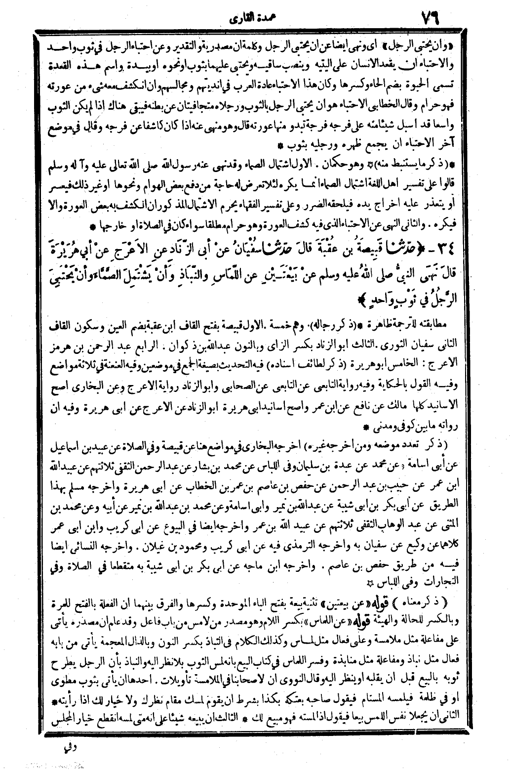 ذكر مَا يستنبط مِنْهُ وَهُوَ حكمان: الأول: اشْتِمَال الصماء، وَقد نهى عَنهُ رَسُول ا، قَالُوا: على تَفْسِير أهل اللُّغَة: اشْتِمَال الصماء إِنَّمَا يكره لِئَلَّا تعرض لَهُ حَاجَة من دفع بعض الْهَوَام وَنَحْوهَا أَو غير ذَلِك، فيعسر أَو يتَعَذَّر عَلَيْهِ إِخْرَاج يَده، فيلحقه الضَّرَر. وعَلى تَفْسِير الْفُقَهَاء: يحرم الاشتمال الْمَذْكُور إِن انْكَشَفَ بِهِ بعض الْعَوْرَة، وَإِلَّا فَيكْرَه. وَالثَّانِي: النَّهْي عَن الاحتباء الَّذِي فِيهِ كشف الْعَوْرَة، وَهُوَ حرَام مُطلقًا، سَوَاء كَانَ فِي الصَّلَاة أَو خَارِجهَا.