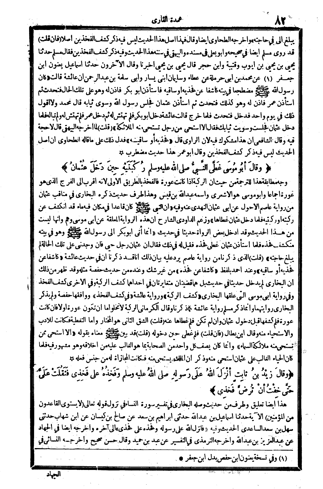 وَأخرجه الطَّحَاوِيّ أَيْضا، وَقَالَ: فَهَذَا أصل هَذَا الحَدِيث، لَيْسَ فِيهِ ذكر كشف الفخذين أصلا فَإِن قلت: قد روى مُسلم أَيْضا فِي (صَحِيحه) وَأَبُو يعلى فِي (مُسْنده) وَالْبَيْهَقِيّ فِي (سنَنه) هَذَا الحَدِيث، وَفِيه ذكر كشف الفخذين. فَقَالَ مُسلم: حدّثنا يحيى بن يحيى بن أَيُّوب وقتيبة وَابْن حجر، قَالَ يحيى بن يحيى: أخبرنَا، وَقَالَ الْآخرُونَ: حدّثنا إِسْمَاعِيل يعنون ابْن جَعْفَر (1) عَن مُحَمَّد بن أبي حَرْمَلَة عَن عَطاء وَسليمَان ابْني يسَار وَأبي سَلمَة بن عبد الرَّحْمَن أَن عَائِشَة قَالَت: (كَانَ رَسُول الله مُضْطَجعا فِي بَيته كاشفاً عَن فَخذيهِ أَو سَاقيه، فَاسْتَأْذن أَبُو بكر فَأذن لَهُ وَهُوَ على تِلْكَ الْحَال، فَتحدث ثمَّ اسْتَأْذن عمر فَأذن لَهُ وَهُوَ كَذَلِك، فَتحدث ثمَّ اسْتَأْذن عُثْمَان فَجَلَسَ رَسُول اوسوى ثِيَابه. قَالَ مُحَمَّد: وَلَا أَقُول ذَلِك فِي يَوْم وَاحِد فَدخل فَتحدث، فَلَمَّا خرج قَالَت عَائِشَة: دخل أَبُو بكر فَلم تهتش لَهُ، ثمَّ دخل عمر فَلم تهتش لَهُ وَلم تباله، فَلَمَّا دخل عُثْمَان فَجَلَست وسويت ثِيَابك؟ فَقَالَ) ألاَ أستحي من رجل تَسْتَحي مِنْهُ الْمَلَائِكَة؟ ، قلت: لما أخرجه الْبَيْهَقِيّ قَالَ. لَا حجَّة فِيهِ. وَقَالَ الشَّافِعِي: إِن هَذَا مَشْكُوك فِيهِ لِأَن الرَّاوِي قَالَ: (فَخذيهِ أَو سَاقيه) ، فَدلَّ ذَلِك على مَا قَالَه الطَّحَاوِيّ: إِن أصل الحَدِيث لَيْسَ فِيهِ ذكر كشف الفخذين، وَقَالَ أَبُو عمر: هَذَا حَدِيث مُضْطَرب.