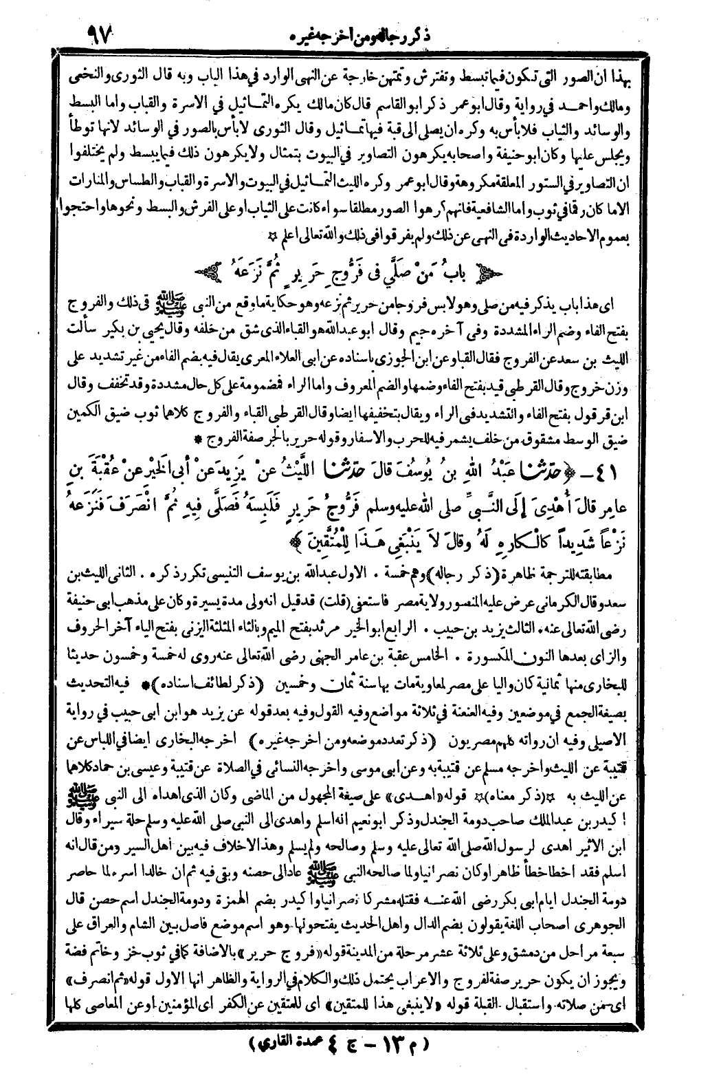 41 - (حَدثنَا عبد الله بن يُوسُف قَالَ حَدثنَا اللَّيْث عَن يزِيد عَن أبي الْخَيْر عَن عقبَة بن عَامر قَالَ أهدي إِلَى النَّبِي - صَلَّى اللَّهُ عَلَيْهِ وَسَلَّم َ - فروج حَرِير فلبسه فصلى فِيهِ ثمَّ انْصَرف فَنَزَعَهُ نزعا شَدِيدا كالكاره لَهُ وَقَالَ لَا يَنْبَغِي هَذَا لِلْمُتقين) مطابقته للتَّرْجَمَة ظَاهِرَة. (ذكر رِجَاله) وهم خَمْسَة. الأول عبد الله بن يُوسُف التنيسِي تكَرر ذكره. الثَّانِي اللَّيْث بن سعد وَقَالَ الْكرْمَانِي عرض عَلَيْهِ الْمَنْصُور ولَايَة مصر فاستعفى (قلت) قد قيل أَنه ولي مُدَّة يسيرَة وَكَانَ على مَذْهَب أبي حنيفَة رَضِي الله تَعَالَى عَنهُ. الثَّالِث يزِيد بن حبيب. الرَّابِع أَبُو الْخَيْر مرْثَد بِفَتْح الْمِيم وبالثاء الْمُثَلَّثَة الْيَزنِي بِفَتْح الْيَاء آخر الْحُرُوف وَالزَّاي بعْدهَا النُّون الْمَكْسُورَة. الْخَامِس عقبَة بن عَامر الْجُهَنِيّ رَضِي الله تَعَالَى عَنهُ روى لَهُ خَمْسَة وَخَمْسُونَ حَدِيثا للْبُخَارِيّ مِنْهَا ثَمَانِيَة كَانَ واليا على مصر لمعاوية مَاتَ بهَا سنة ثَمَان وَخمسين. (ذكر لطائف إِسْنَاده) فِيهِ التحديث بِصِيغَة الْجمع فِي موضِعين وَفِيه العنعنة فِي ثَلَاثَة مَوَاضِع وَفِيه القَوْل وَفِيه بعد قَوْله عَن يزِيد هُوَ ابْن أبي حبيب فِي رِوَايَة الْأصيلِيّ وَفِيه أَن رُوَاته كلهم مصريون. (ذكر تعدد مَوْضِعه وَمن أخرجه غَيره) أخرجه البُخَارِيّ أَيْضا فِي اللبَاس عَن قُتَيْبَة عَن اللَّيْث وَأخرجه مُسلم عَن قُتَيْبَة بِهِ وَعَن أبي مُوسَى وَأخرجه النَّسَائِيّ فِي الصَّلَاة عَن قُتَيْبَة وَعِيسَى بن حَمَّاد كِلَاهُمَا عَن اللَّيْث بِهِ. (ذكر مَعْنَاهُ) قَوْله " أهدي " على صِيغَة الْمَجْهُول من الْمَاضِي وَكَانَ الَّذِي أهداه إِلَى النَّبِي - صَلَّى اللَّهُ عَلَيْهِ وَسَلَّم َ - أكيدر بن عبد الْملك صَاحب دومة الجندل وَذكر أَبُو نعيم أَنه أسلم وَأهْدى إِلَى النَّبِي - صَلَّى اللَّهُ عَلَيْهِ وَسَلَّم َ - حلَّة سيراء وَقَالَ ابْن الْأَثِير أهْدى لرَسُول الله - صَلَّى اللَّهُ عَلَيْهِ وَسَلَّم َ - وَصَالَحَهُ وَلم يسلم وَهَذَا لَا خلاف فِيهِ بَين أهل السّير وَمن قَالَ أَنه أسلم فقد أَخطَأ خطأ ظَاهر أَو كَانَ نَصْرَانِيّا وَلما صَالحه النَّبِي - صَلَّى اللَّهُ عَلَيْهِ وَسَلَّم َ - عَاد إِلَى حصنه وَبَقِي فِيهِ ثمَّ أَن خَالِدا أسره لما حاصر دومة الجندل أَيَّام أبي بكر رَضِي الله عَنهُ فَقتله مُشْركًا نَصْرَانِيّا وأكيدر بِضَم الْهمزَة ودومة الجندل اسْم حصن قَالَ الْجَوْهَرِي أَصْحَاب اللُّغَة يَقُولُونَ بِضَم الدَّال وَأهل الحَدِيث يفتحونها وَهُوَ اسْم مَوضِع فاصل بَين الشَّام وَالْعراق على سَبْعَة مراحل من دمشق وعَلى ثَلَاثَة عشر مرحلة من الْمَدِينَة قَوْله " فروج حَرِير " بِالْإِضَافَة كَمَا فِي ثوب خَز وَخَاتم فضَّة وَيجوز أَن يكون حَرِير صفة لفروج وَالْإِعْرَاب يحْتَمل ذَلِك وَالْكَلَام فِي الرِّوَايَة وَالظَّاهِر أَنَّهَا الأول قَوْله " ثمَّ انْصَرف " أَي من صلَاته واستقبال الْقبْلَة قَوْله " لَا يَنْبَغِي هَذَا لِلْمُتقين " أَي لِلْمُتقين عَن الْكفْر أَي الْمُؤمنِينَ أَو عَن الْمعاصِي كلهَا