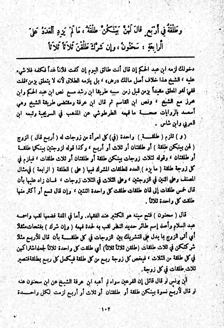 قَالَ (سَحْنُونٌ) فَتْحُ سِينِهِ هُوَ الْكَثِيرُ عِنْدَ الْفُقَهَاءِ. وَأَمَّا فِي اللُّغَةِ فَضَمُّهَا لَقَبٌ وَاسْمُهُ عَبْدُ السَّلَامِ وَأَصْلُهُ اسْمُ طَائِرٍ حَدِيدِ النَّظَرِ لُقِّبَ بِهِ لِحِدَّةِ فَهْمِهِ (وَإِنْ شَرَّكَ) بِفَتَحَاتٍ مُثَقَّلًا أَيْ أَتَى الزَّوْجُ بِمَا يَدُلُّ عَلَى التَّشْرِيكِ بَيْنَ الزَّوْجَاتِ فِي كُلِّ طَلْقَةٍ بِأَنْ قَالَ لِلْأَرْبَعِ مَثَلًا شَرِكَتُكُنَّ فِي ثَلَاثِ طَلَقَاتٍ (طَلَقْنَ ثَلَاثًا ثَلَاثًا) أَيْ طَلَقَتْ كُلُّ وَاحِدَةٍ ثَلَاثًا لِجَعْلِهِ اشْتِرَاكَهُنَّ فِي كُلِّ طَلْقَةٍ مِنْ الثَّلَاثِ، فَيَخُصُّ كُلَّ زَوْجَةٍ رُبُعٌ مِنْ كُلِّ طَلْقَةٍ فَيَكْمُلُ كُلُّ رُبُعٍ بِطَلْقَةٍ فَتَصِيرُ ثَلَاثُ طَلَقَاتٍ فِي كُلِّ زَوْجَةٍ.