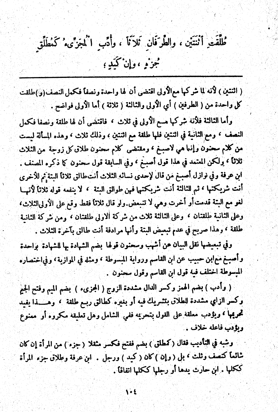 وَأَمَّا الثَّالِثَةُ فَلِأَنَّهُ شَرَّكَهَا مَعَ الْأُولَى فِي ثَلَاثٍ، فَاقْتَضَى أَنَّ لَهَا طَلْقَةً وَنِصْفًا فَكُمِّلَ النِّصْفُ، وَمَعَ الثَّانِيَةِ فِي اثْنَتَيْنِ فَلَهَا طَلْقَةٌ مَعَ اثْنَتَيْنِ، وَذَلِكَ ثَلَاثٌ، وَهَذِهِ الْمَسْأَلَةُ لَيْسَتْ مِنْ كَلَامِ سَحْنُونٍ وَإِنَّمَا هِيَ لِأَصْبَغَ، وَمُقْتَضَى سَحْنُونٍ طَلَاقُ كُلِّ زَوْجَةٍ مِنْ الثَّلَاثِ ثَلَاثًا، وَلَكِنَّ الْمُعْتَمَدَ فِي هَذَا قَوْلُ أَصْبَغَ، وَفِي السَّابِقَةِ قَوْلُ سَحْنُونٍ كَمَا ذَكَرَهُ الْمُصَنِّفُ. ابْنُ عَرَفَةَ وَفِي نَوَازِلِ أَصْبَغَ مَنْ قَالَ لِإِحْدَى نِسَائِهِ الثَّلَاثِ أَنْتِ طَالِقٌ ثَلَاثًا أَلْبَتَّةَ ثُمَّ لِلْأُخْرَى أَنْتِ شَرِيكَتُهَا، ثُمَّ لِلثَّالِثَةِ أَنْتِ شَرِيكَتُهُمَا فَهُنَّ طَوَالِقُ أَلْبَتَّةَ، لَا يَنْفَعُهُ قَوْلُهُ ثَلَاثًا لِأَنَّهَا لَغْوٌ مَعَ الْبَتَّةِ قُدِّمَتْ أَوْ أُخِّرَتْ وَهِيَ لَا تَتَبَعَّضُ. وَلَوْ قَالَ ثَلَاثًا فَقَطْ وَقَعَ عَلَى الْأُولَى الثَّلَاثُ، وَعَلَى الثَّانِيَةِ طَلْقَتَانِ، وَعَلَى الثَّالِثَةِ ثَلَاثٌ مِنْ شِرْكَةِ الْأُولَى طَلْقَتَانِ، وَمِنْ شَرِكَةِ الثَّانِيَةِ طَلْقَةٌ، وَهَذَا صَرِيحٌ فِي عَدَمِ تَبْعِيضِ الْبَتَّةِ وَأَنَّهَا مُرَادِفَةُ أَنْتِ طَالِقٌ بِآخِرَةِ الثَّلَاثِ وَفِي تَبْعِيضِهَا نَقَلَ الْبَيَانُ عَنْ أَشْهَبَ وَسَحْنُونٍ قَوْلَهُمَا بِضَمِّ الشَّهَادَةِ بِهَا لِلشَّهَادَةِ بِوَاحِدَةٍ وَأَصْبَغُ مَعَ ابْنِ حَبِيبٍ عَنْ ابْنِ الْقَاسِمِ وَرِوَايَةِ الْمَبْسُوطَةِ وَمِثْلُهُ فِي الْمَوَّازِيَّةِ، وَفِي اخْتِصَارِهِ الْمَبْسُوطَةِ اخْتَلَفَ فِيهِ قَوْلُ ابْنِ الْقَاسِمِ وَقَوْلُ سَحْنُونٍ.