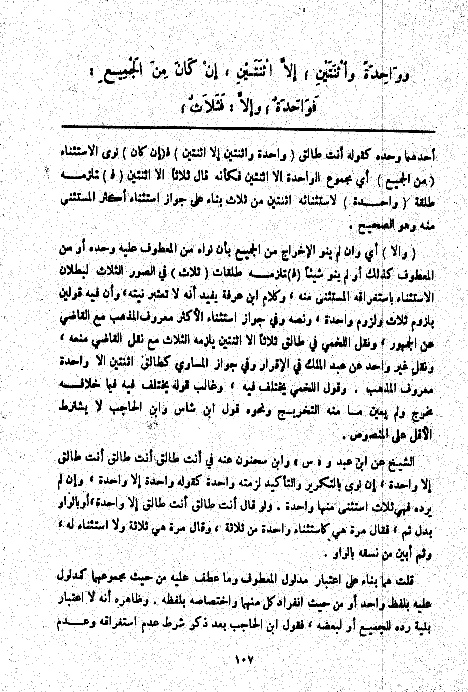 (وَإِلَّا) أَيْ وَإِنْ لَمْ يَنْوِ الْإِخْرَاجَ مِنْ الْجَمِيعِ بِأَنْ نَوَاهُ مِنْ الْمَعْطُوفِ عَلَيْهِ وَحْدَهُ أَوْ مِنْ الْمَعْطُوفِ كَذَلِكَ أَوْ لَمْ يَنْوِ شَيْئًا (فَ) تَلْزَمُهُ طَلَقَاتٌ (ثَلَاثٌ) فِي الصُّوَرِ الثَّلَاثِ لِبُطْلَانِ الِاسْتِثْنَاءِ بِاسْتِغْرَاقِهِ الْمُسْتَثْنَى مِنْهُ، وَكَلَامُ ابْنِ عَرَفَةَ يُفِيدُ أَنَّهُ لَا تُعْتَبَرُ نِيَّتُهُ، وَأَنَّ فِيهِ قَوْلَيْنِ بِلُزُومِ ثَلَاثٍ وَلُزُومِ وَاحِدَةٍ، وَنَصُّهُ وَفِي جَوَازِ اسْتِثْنَاءِ الْأَكْثَرِ مَعْرُوفُ الْمَذْهَبِ مَعَ الْقَاضِي عَنْ الْجُمْهُورِ، وَنَقَلَ اللَّخْمِيُّ فِي طَالِقٍ ثَلَاثًا إلَّا اثْنَتَيْنِ يَلْزَمُهُ الثَّلَاثُ مَعَ نَقْلِ الْقَاضِي مَنْعَهُ، وَنَقَلَ غَيْرُ وَاحِدٍ عَنْ عَبْدِ الْمَلِكِ فِي الْإِقْرَارِ وَفِي جَوَازِ الْمُسَاوِي كَطَالِقٍ اثْنَتَيْنِ إلَّا وَاحِدَةً مَعْرُوفَ الْمَذْهَبِ. وَقَوْلُ اللَّخْمِيِّ يُخْتَلَفُ فِيهِ، وَغَالِبُ قَوْلِهِ يُخْتَلَفُ فِيهِ فِيمَا خِلَافُهُ مُخَرَّجٌ وَلَمْ يُعَيِّنْ مَا مِنْهُ التَّخْرِيجُ وَنَحْوُهُ قَوْلُ ابْنِ شَاسٍ وَابْنِ الْحَاجِبِ لَا يُشْتَرَطُ الْأَقَلُّ عَلَى الْمَنْصُوصِ.
