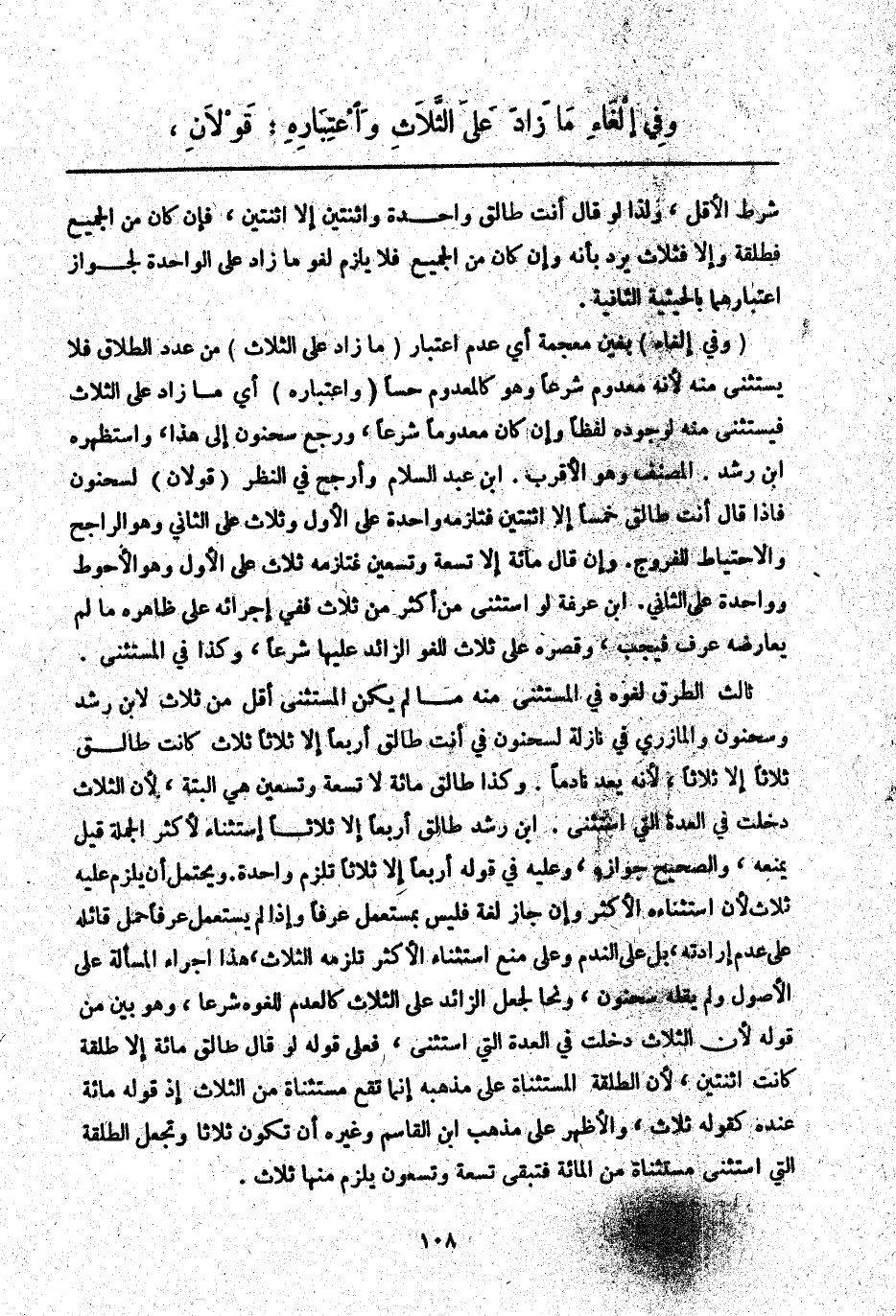 (وَفِي إلْغَاءِ) بِغَيْنٍ مُعْجَمَةٍ أَيْ عَدَمِ اعْتِبَارِ (مَا زَادَ عَلَى الثَّلَاثِ) مِنْ عَدَدِ الطَّلَاقِ فَلَا يُسْتَثْنَى مِنْهُ لِأَنَّهُ مَعْدُومٌ شَرْعًا وَهُوَ كَالْمَعْدُومِ حِسًّا (وَاعْتِبَارُهُ) أَيْ مَا زَادَ عَلَى الثَّلَاثِ فَيُسْتَثْنَى مِنْهُ لِوُجُودِهِ لَفْظًا وَإِنْ كَانَ مَعْدُومًا شَرْعًا، وَرَجَعَ سَحْنُونٌ إلَى هَذَا وَاسْتَظْهَرَهُ ابْنُ رُشْدٍ. الْمُصَنِّفُ وَهُوَ الْأَقْرَبُ. ابْنُ عَبْدِ السَّلَامِ وَأَرْجَحُ فِي النَّظَرِ (قَوْلَانِ) لِسَحْنُونٍ فَإِذَا قَالَ أَنْتِ طَالِقٌ خَمْسًا إلَّا اثْنَتَيْنِ فَتَلْزَمُهُ وَاحِدَةٌ عَلَى الْأَوَّلِ وَثَلَاثٌ عَلَى الثَّانِي وَهُوَ الرَّاجِحُ وَالِاحْتِيَاطُ لِلْفُرُوجِ. وَإِنْ قَالَ مِائَةً إلَّا تِسْعَةً وَتِسْعِينَ فَتَلْزَمُهُ ثَلَاثٌ عَلَى الْأَوَّلِ وَهُوَ الْأَحْوَطُ وَوَاحِدَةٌ عَلَى الثَّانِي. ابْنُ عَرَفَةَ لَوْ اسْتَثْنَى مِنْ أَكْثَرَ مِنْ ثَلَاثٍ فَفِي إجْرَائِهِ عَلَى ظَاهِرِهِ مَا لَمْ يُعَارِضْهُ عُرْفٌ فَيَجِبُ، وَقَصْرُهُ عَلَى ثَلَاثٍ لِلَّغْوِ الزَّائِدِ عَلَيْهَا شَرْعًا وَكَذَا فِي الْمُسْتَثْنَى.
