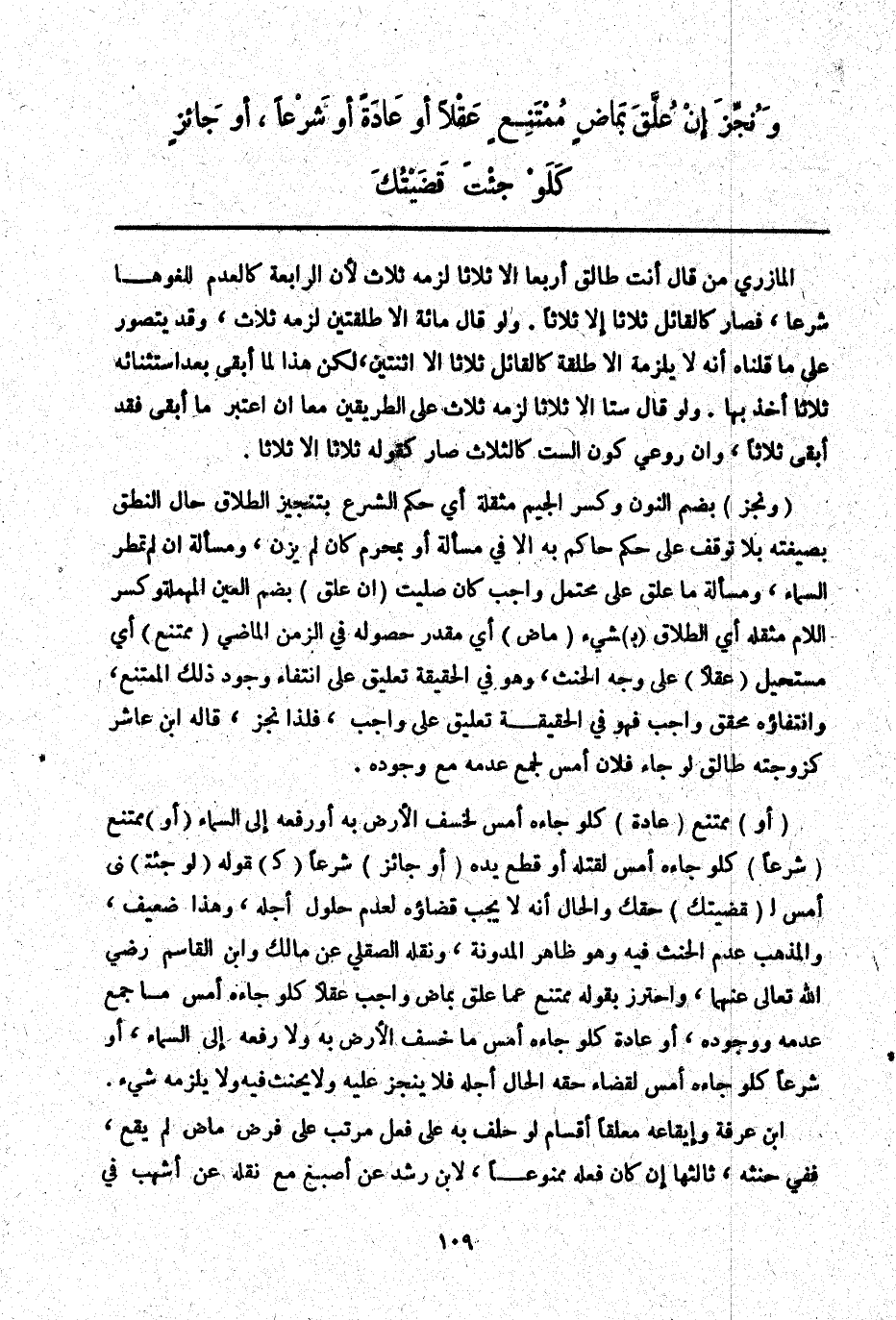(وَنُجِّزَ) بِضَمِّ النُّونِ وَكَسْرِ الْجِيمِ مُثَقَّلَةً أَيْ حَكَمَ الشَّرْعُ بِتَنْجِيزِ الطَّلَاقِ حَالَ النُّطْقِ بِصِيغَتِهِ بِلَا تَوَقُّفٍ عَلَى حُكْمِ حَاكِمٍ بِهِ إلَّا فِي مَسْأَلَةٍ أَوْ بِمُحَرَّمٍ كَإِنْ لَمْ يَزْنِ، وَمَسْأَلَةِ إنْ لَمْ تُمْطِرْ السَّمَاءُ، وَمَسْأَلَةِ مَا عُلِّقَ عَلَى مُحْتَمَلٍ وَاجِبٍ كَإِنْ صَلَّيْت (إنْ عُلِّقَ) بِضَمِّ الْعَيْنِ الْمُهْمَلَةِ وَكَسْرِ اللَّامِ مُثَقَّلَةً أَيْ الطَّلَاقُ (بِ) شَيْءٍ (مَاضٍ) أَيْ مُقَدَّرٍ حُصُولُهُ فِي الزَّمَنِ الْمَاضِي (مُمْتَنِعٍ) أَيْ مُسْتَحِيلٍ (عَقْلًا) عَلَى وَجْهِ الْحِنْثِ، وَهُوَ فِي الْحَقِيقَةِ تَعْلِيقٌ عَلَى انْتِفَاءِ وُجُودِ ذَلِكَ الْمُمْتَنِعِ، وَانْتِفَاؤُهُ مُحَقَّقٌ وَاجِبٌ فَهُوَ فِي الْحَقِيقَةِ تَعْلِيقٌ عَلَى وَاجِبٍ، فَلِذَا نُجِّزَ، قَالَهُ ابْنُ عَاشِرٍ كَزَوْجَتِهِ طَالِقٌ لَوْ جَاءَ فُلَانٌ أَمْسِ لِجَمْعِ عَدَمِهِ مَعَ وُجُودِهِ.