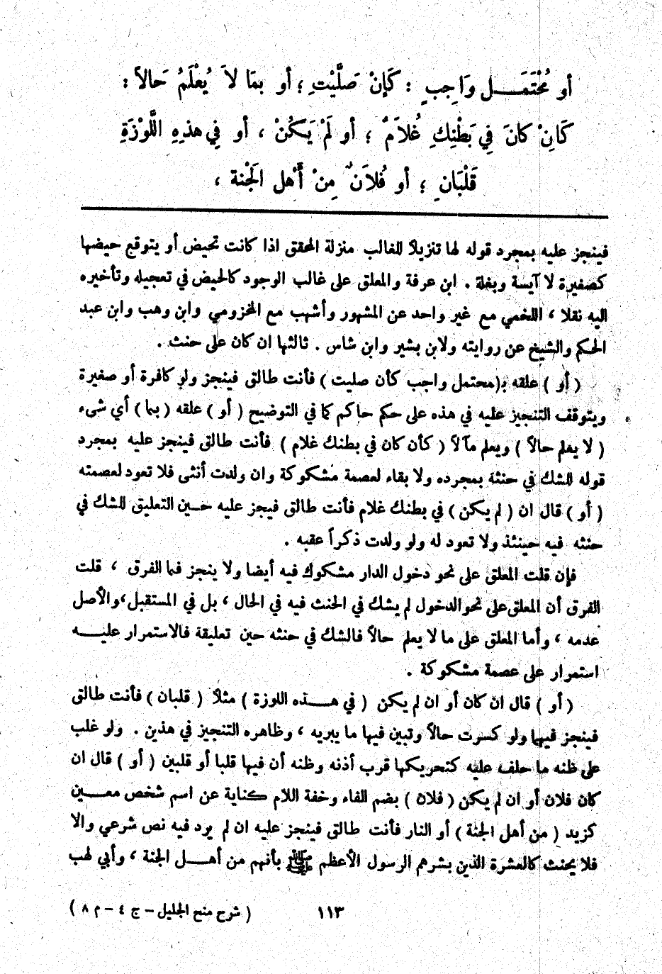 (أَوْ) عَلَّقَهُ بِ (مُحْتَمَلٍ وَاجِبٍ كَإِنْ صَلَّيْت) فَأَنْتِ طَالِقٌ فَيُنَجَّزُ وَلَوْ كَافِرَةً أَوْ صَغِيرَةً وَيَتَوَقَّفُ التَّنْجِيزُ عَلَيْهِ فِي هَذِهِ عَلَى حُكْمِ حَاكِمٍ كَمَا فِي التَّوْضِيحِ (أَوْ) عَلَّقَهُ (بِمَا) أَيْ شَيْءٍ (لَا يُعْلَمُ حَالًا) وَيُعْلَمُ مَآلًا (كَإِنْ كَانَ فِي بَطْنِك غُلَامٌ) فَأَنْتِ طَالِقٌ فَيُنَجَّزُ عَلَيْهِ بِمُجَرَّدِ قَوْلِهِ لِلشَّكِّ فِي حِنْثِهِ بِمُجَرَّدِهِ وَلَا بَقَاءَ لِعِصْمَةٍ مَشْكُوكَةٍ وَإِنْ وَلَدَتْ أُنْثَى فَلَا تَعُودُ لِعِصْمَتِهِ (أَوْ) قَالَ إنْ (لَمْ يَكُنْ) فِي بَطْنِك غُلَامٌ فَأَنْتِ طَالِقٌ فَيُنَجَّزُ عَلَيْهِ حِينَ التَّعْلِيقِ لِلشَّكِّ فِي حِنْثِهِ فِيهِ حِينَئِذٍ وَلَا تَعُودُ لَهُ وَلَوْ وَلَدَتْ ذَكَرًا عَقِبَهُ.
