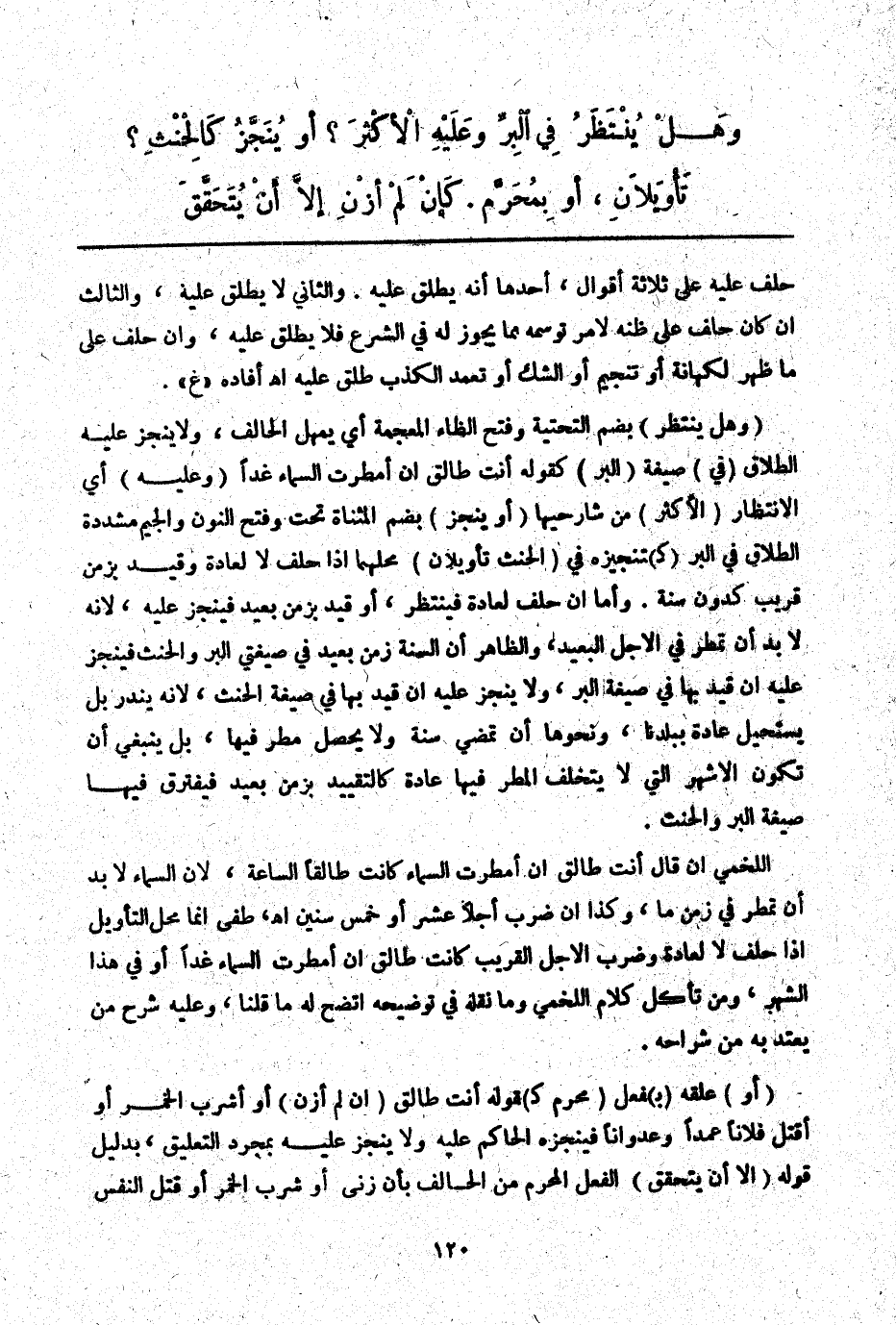 (وَهَلْ يُنْتَظَرُ) بِضَمِّ التَّحْتِيَّةِ وَفَتْحِ الظَّاءِ الْمُعْجَمَةِ أَيْ يُمَهَّلُ الْحَالِفُ، وَلَا يُنَجَّزُ عَلَيْهِ الطَّلَاقُ (فِي) صِيغَةِ (الْبِرِّ) كَقَوْلِهِ أَنْتِ طَالِقٌ إنْ أَمْطَرَتْ السَّمَاءُ غَدًا (وَعَلَيْهِ) أَيْ الِانْتِظَارِ (الْأَكْثَرُ) مِنْ شَارِحِيهَا (أَوْ يُنَجَّزُ) بِضَمِّ الْمُثَنَّاةِ تَحْتُ وَفَتْحِ النُّونِ وَالْجِيمِ مُشَدَّدَةً الطَّلَاقُ فِي الْبِرِّ (كَ) تَنْجِيزِهِ فِي (الْحِنْثِ تَأْوِيلَانِ) مَحَلُّهُمَا إذَا حَلَفَ لَا لِعَادَةٍ وَقَيَّدَ بِزَمَنٍ قَرِيبٍ كَدُونِ سَنَةٍ. وَأَمَّا إنْ حَلَفَ لِعَادَةٍ فَيُنْتَظَرُ، أَوْ قَيَّدَ بِزَمَنٍ بَعِيدٍ فَيُنَجَّزُ عَلَيْهِ لِأَنَّهُ لَا بُدَّ أَنْ تُمْطِرَ فِي الْأَجَلِ الْبَعِيدِ، وَالظَّاهِرُ أَنَّ السَّنَةَ زَمَنٌ بَعِيدٌ فِي صِيغَتَيْ الْبِرِّ وَالْحِنْثِ فَيُنَجَّزُ عَلَيْهِ إنْ قَيَّدَ بِهَا فِي صِيغَةِ الْبِرِّ، وَلَا يُنَجَّزُ عَلَيْهِ إنْ قَيَّدَ بِهَا فِي صِيغَةِ الْحِنْثِ لِأَنَّهُ يَنْدُرُ بَلْ يَسْتَحِيلُ عَادَةً بِبَلَدِنَا، وَنَحْوِهَا أَنْ تَمْضِيَ سَنَةٌ وَلَا يَحْصُلُ مَطَرٌ فِيهَا، بَلْ يَنْبَغِي أَنْ تَكُونَ الْأَشْهُرُ الَّتِي لَا يَتَخَلَّفُ الْمَطَرُ فِيهَا عَادَةً كَالتَّقْيِيدِ بِزَمَنٍ بَعِيدٍ فَيَفْتَرِقُ فِيهَا صِيغَةُ الْبِرِّ وَالْحِنْثِ.