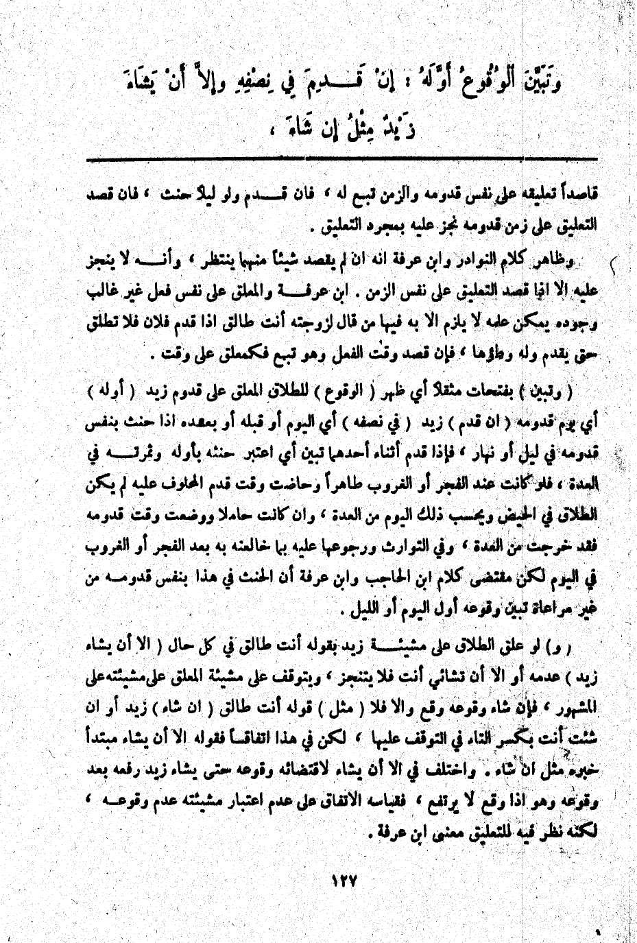 وَظَاهِرُ كَلَامِ النَّوَادِرِ وَابْنِ عَرَفَةَ أَنَّهُ إنْ لَمْ يَقْصِدْ شَيْئًا مِنْهُمَا يُنْتَظَرُ، وَأَنَّهُ لَا يُنَجَّزُ عَلَيْهِ إلَّا إذَا قَصَدَ التَّعْلِيقَ عَلَى نَفْسِ الزَّمَنِ. ابْنُ عَرَفَةَ وَالْمُعَلَّقُ عَلَى نَفْسِ فِعْلٍ غَيْرِ غَالِبٍ وُجُودُهُ يُمْكِنُ عِلْمُهُ لَا يَلْزَمُ إلَّا بِهِ فِيهَا مَنْ قَالَ لِزَوْجَتِهِ أَنْتِ طَالِقٌ إذَا قَدِمَ فُلَانٌ فَلَا تَطْلُقُ حَتَّى يَقْدَمَ وَلَهُ وَطْؤُهَا، فَإِنْ قَصَدَ وَقْتَ الْفِعْلِ وَهُوَ تَبَعٌ فَكَمُعَلَّقٍ عَلَى وَقْتٍ.