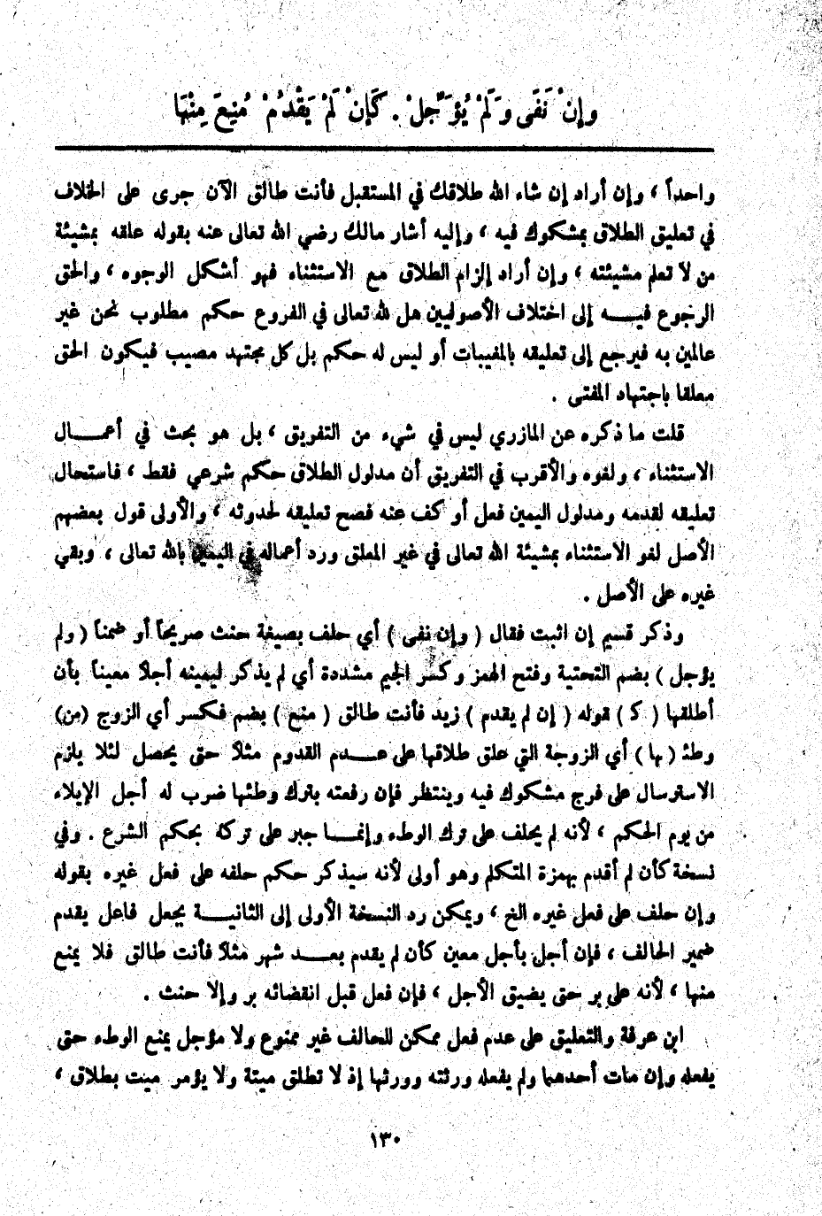 ابْنُ عَرَفَةَ وَالتَّعْلِيقُ عَلَى عَدَمِ فِعْلٍ مُمْكِنٍ لِلْحَالِفِ غَيْرُ مَمْنُوعٍ وَلَا مُؤَجَّلٍ يَمْنَعُ الْوَطْءَ حَتَّى يَفْعَلَهُ وَإِنْ مَاتَ أَحَدُهُمَا وَلَمْ يَفْعَلْهُ وَرِثَتْهُ وَوَرِثَهَا إذْ لَا تَطْلُقُ مَيِّتَةً وَلَا يُؤْمَرُ مَيِّتٌ بِطَلَاقٍ،