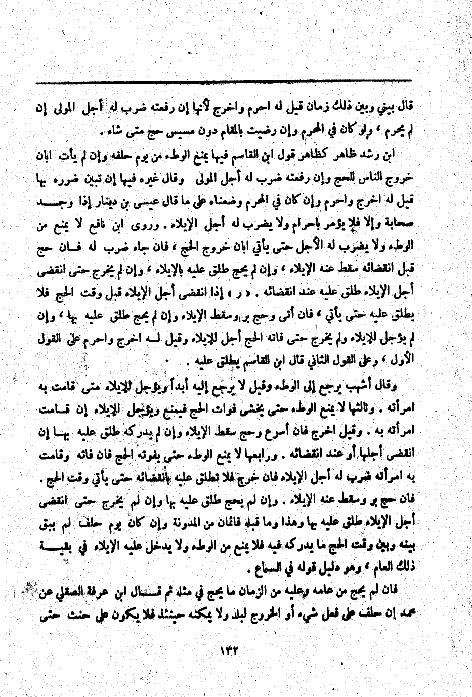 ابْنُ رُشْدٍ ظَاهِرٌ كَظَاهِرِ قَوْلِ ابْنِ الْقَاسِمِ فِيهَا يُمْنَعُ الْوَطْءُ مِنْ يَوْمِ حَلِفِهِ وَإِنْ لَمْ يَأْتِ إبَّانَ خُرُوجِ النَّاسِ لِلْحَجِّ وَإِنْ رَفَعَتْهُ ضُرِبَ لَهُ أَجَلُ الْمُولِي وَقَالَ غَيْرُهُ فِيهَا إنْ تَبَيَّنَ ضَرَرُهُ بِهَا قِيلَ لَهُ اُخْرُجْ وَأَحْرِمْ وَإِنْ كَانَ فِي الْمَحْرَمِ وَضَعْنَاهُ عَلَى مَا قَالَ عِيسَى بْنُ دِينَارٍ إذَا وَجَدَ صَحَابَةً وَإِلَّا فَلَا يُؤْمَرُ بِإِحْرَامٍ وَلَا يُضْرَبُ لَهُ أَجَلُ الْإِيلَاءِ. وَرَوَى ابْنُ نَافِعٍ لَا يُمْنَعُ مِنْ الْوَطْءِ وَلَا يُضْرَبُ لَهُ الْأَجَلُ حَتَّى يَأْتِيَ إبَّانَ خُرُوجِ الْحَجِّ، فَإِنْ جَاءَ ضُرِبَ لَهُ فَإِنْ حَجَّ قَبْلَ انْقِضَائِهِ سَقَطَ عَنْهُ الْإِيلَاءُ، وَإِنْ لَمْ يَحُجَّ طَلَّقَ عَلَيْهِ بِالْإِيلَاءِ، وَإِنْ لَمْ يَخْرُجْ حَتَّى انْقَضَى أَجَلُ الْإِيلَاءِ طَلَّقَ عَلَيْهِ عِنْدَ انْقِضَائِهِ. " ر " إذَا انْقَضَى أَجَلُ الْإِيلَاءِ قَبْلَ وَقْتِ الْحَجِّ فَلَا يُطَلِّقُ عَلَيْهِ حَتَّى يَأْتِيَ، فَإِنْ أَتَى وَحَجَّ بَرَّ وَسَقَطَ الْإِيلَاءُ وَإِنْ لَمْ يَحُجَّ طَلَّقَ عَلَيْهِ بِهَا، وَإِنْ لَمْ يُؤَجِّلْ لِلْإِيلَاءِ وَلَمْ يَخْرُجْ حَتَّى فَاتَهُ الْحَجُّ أُجِّلَ لِلْإِيلَاءِ وَقِيلَ لَهُ اُخْرُجْ وَأَحْرِمْ عَلَى الْقَوْلِ الْأَوَّلِ، وَعَلَى الْقَوْلِ الثَّانِي قَالَ ابْنُ الْقَاسِمِ يُطَلِّقُ عَلَيْهِ.