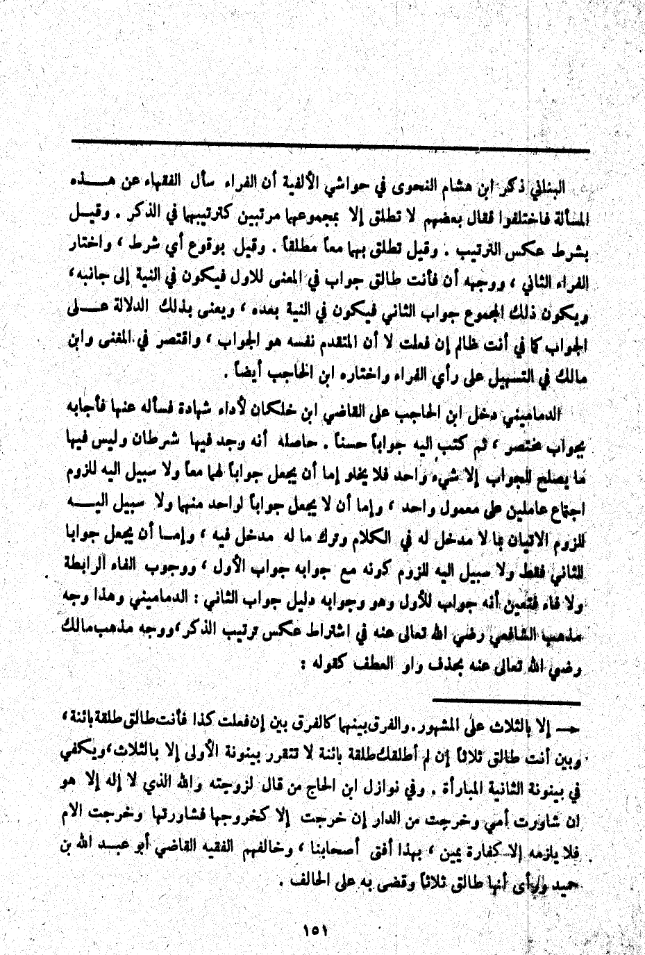 الدَّمَامِينِيُّ دَخَلَ ابْنُ الْحَاجِبِ عَلَى الْقَاضِي ابْنِ خَلِّكَانَ لِأَدَاءِ شَهَادَةٍ فَسَأَلَهُ عَنْهَا فَأَجَابَهُ بِجَوَابٍ مُخْتَصَرٍ، ثُمَّ كَتَبَ إلَيْهِ جَوَابًا حَسَنًا. حَاصِلُهُ أَنَّهُ وُجِدَ فِيهَا شَرْطَانِ وَلَيْسَ فِيهَا مَا يَصْلُحُ لِلْجَوَابِ إلَّا شَيْءٌ وَاحِدٌ فَلَا يَخْلُو إمَّا أَنْ يُجْعَلَ جَوَابًا لَهُمَا مَعًا وَلَا سَبِيلَ إلَيْهِ لِلُزُومِ اجْتِمَاعِ عَامِلَيْنِ عَلَى مَعْمُولٍ وَاحِدٍ، وَإِمَّا أَنْ لَا يُجْعَلَ جَوَابًا لِوَاحِدٍ مِنْهُمَا وَلَا سَبِيلَ إلَيْهِ لِلُزُومِ الْإِتْيَانِ بِمَا لَا مَدْخَلَ لَهُ فِي الْكَلَامِ وَتَرْكِ مَا لَهُ مَدْخَلٌ فِيهِ، وَإِمَّا أَنْ يُجْعَلَ جَوَابًا لِلثَّانِي فَقَطْ وَلَا سَبِيلَ إلَيْهِ لِلُزُومِ كَوْنِهِ مَعَ جَوَابِهِ جَوَابَ الْأَوَّلِ، وَوُجُوبِ الْفَاءِ الرَّابِطَةِ وَلَا فَاءَ فَتَعَيَّنَ أَنَّهُ جَوَابٌ لِلْأَوَّلِ وَهُوَ وَجَوَابُهُ دَلِيلُ جَوَابِ الثَّانِي: الدَّمَامِينِيُّ وَهَذَا وَجْهُ مَذْهَبِ الشَّافِعِيِّ - رَضِيَ اللَّهُ تَعَالَى عَنْهُ - فِي اشْتِرَاطِ عَكْسِ تَرْتِيبِ الذِّكْرِ، وَوَجْهُ مَذْهَبِ مَالِكٍ - رَضِيَ اللَّهُ تَعَالَى عَنْهُ - بِحَذْفِ وَاوِ الْعَطْفِ كَقَوْلِهِ: