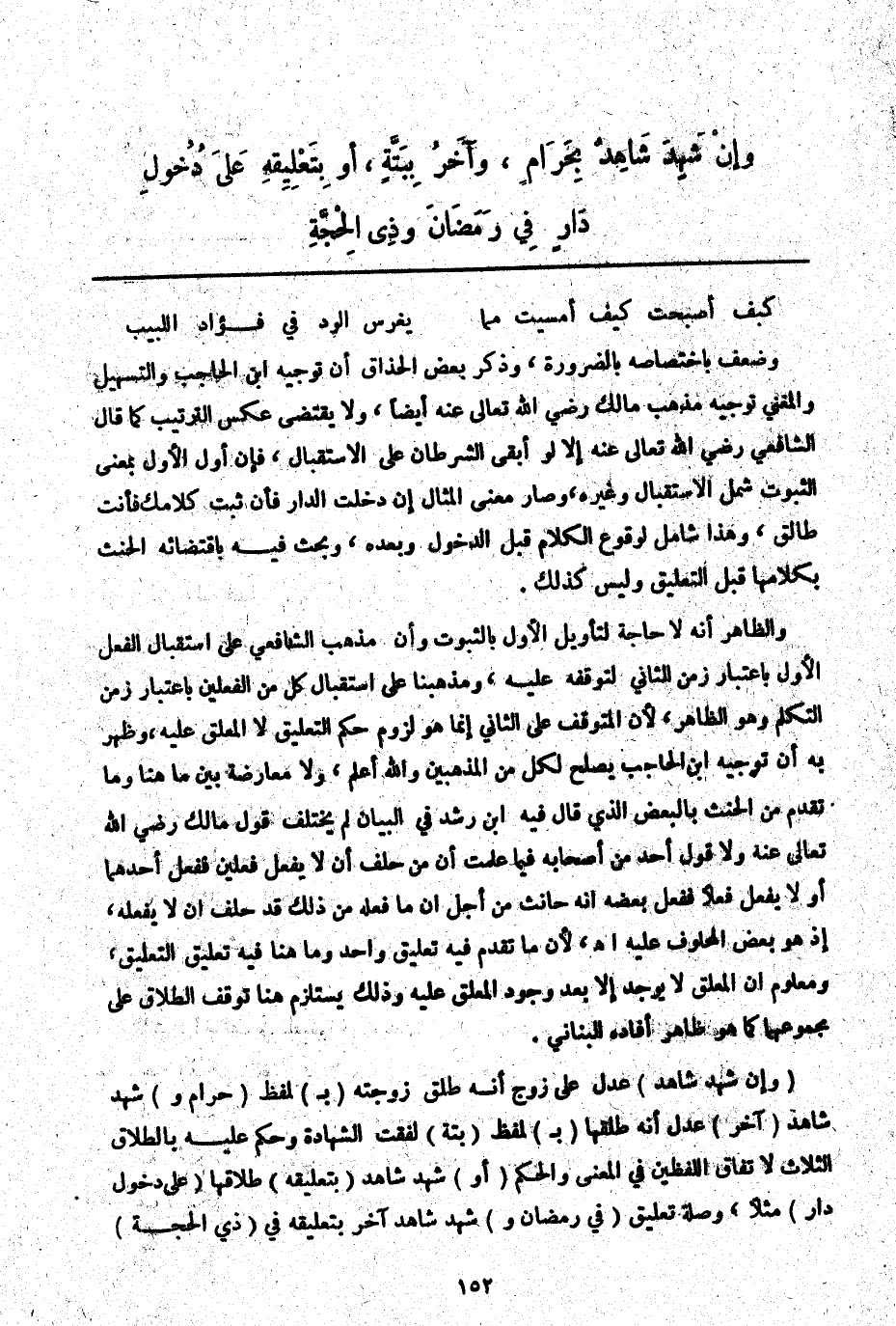 وَالظَّاهِرُ أَنَّهُ لَا حَاجَةَ لِتَأْوِيلِ الْأَوَّلِ بِالثُّبُوتِ وَأَنَّ مَذْهَبَ الشَّافِعِيِّ عَلَى اسْتِقْبَالِ الْفِعْلِ الْأَوَّلِ بِاعْتِبَارِ زَمَنِ الثَّانِي لِتَوَقُّفِهِ عَلَيْهِ، وَمَذْهَبُنَا عَلَى اسْتِقْبَالِ كُلٍّ مِنْ الْفِعْلَيْنِ بِاعْتِبَارِ زَمَنِ التَّكَلُّمِ وَهُوَ الظَّاهِرُ لِأَنَّ الْمُتَوَقِّفَ عَلَى الثَّانِي إنَّمَا هُوَ لُزُومُ حُكْمِ التَّعْلِيقِ لَا الْمُعَلَّقُ عَلَيْهِ، وَظَهَرَ بِهِ أَنَّ تَوْجِيهَ ابْنِ الْحَاجِبِ يَصْلُحُ لِكُلٍّ مِنْ الْمَذْهَبَيْنِ وَاَللَّهُ أَعْلَمُ، وَلَا مُعَارَضَةَ بَيْنَ مَا هُنَا وَمَا تَقَدَّمَ مِنْ الْحِنْثِ بِالْبَعْضِ الَّذِي قَالَ فِيهِ ابْنُ رُشْدٍ فِي الْبَيَانِ لَمْ يَخْتَلِفْ قَوْلُ مَالِكٍ - رَضِيَ اللَّهُ تَعَالَى عَنْهُ - وَلَا قَوْلُ أَحَدٍ مِنْ أَصْحَابِهِ فِيمَا عَلِمْت أَنَّ مَنْ حَلَفَ أَنْ لَا يَفْعَلَ فِعْلَيْنِ فَفَعَلَ أَحَدَهُمَا أَوْ لَا يَفْعَلُ فِعْلًا فَفَعَلَ بَعْضَهُ أَنَّهُ حَانِثٌ مِنْ أَجْلِ أَنَّ مَا فَعَلَهُ مِنْ ذَلِكَ قَدْ حَلَفَ أَنْ لَا يَفْعَلَهُ، إذْ هُوَ بَعْضُ الْمَحْلُوفِ عَلَيْهِ. اهـ. لِأَنَّ مَا تَقَدَّمَ فِيهِ تَعْلِيقٌ وَاحِدٌ وَمَا هُنَا فِيهِ تَعْلِيقُ التَّعْلِيقِ، وَمَعْلُومٌ أَنَّ الْمُعَلَّقَ لَا يُوجَدُ إلَّا بَعْدَ وُجُودِ الْمُعَلَّقِ عَلَيْهِ وَذَلِكَ يَسْتَلْزِمُ هُنَا تَوَقُّفَ الطَّلَاقِ عَلَى مَجْمُوعِهِمَا كَمَا هُوَ ظَاهِرُ أَفَادَهُ الْبُنَانِيُّ.