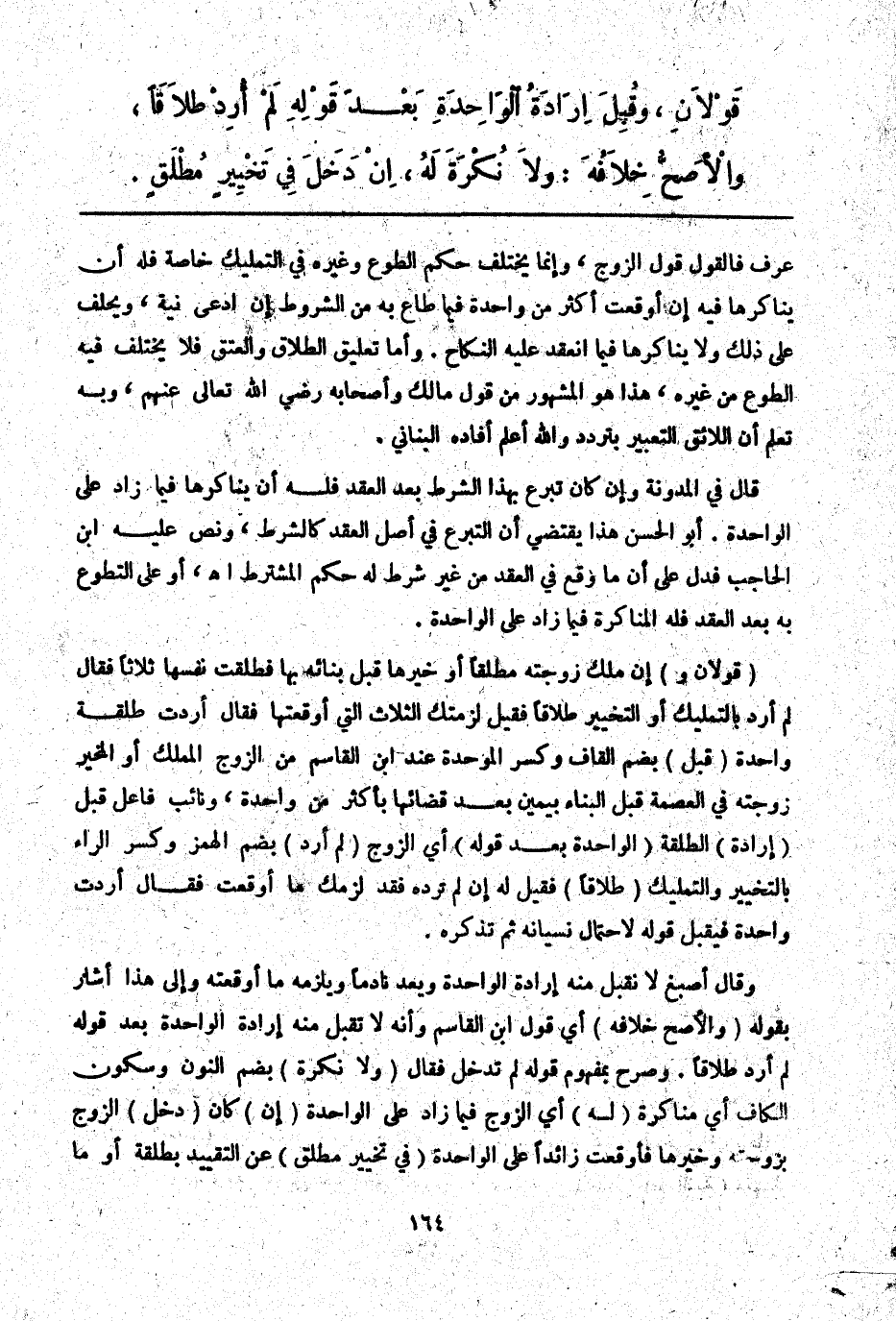 (قَوْلَانِ وَ) إنْ مَلَّكَ زَوْجَتَهُ مُطْلَقًا أَوْ خَيَّرَهَا قَبْلَ بِنَائِهِ بِهَا فَطَلَّقَتْ نَفْسَهَا ثَلَاثًا فَقَالَ لَمْ أُرِدْ بِالتَّمْلِيكِ أَوْ التَّخْيِيرِ طَلَاقًا فَقِيلَ: لَزِمَتْك الثَّلَاثُ الَّتِي أَوْقَعَتْهَا فَقَالَ أَرَدْت طَلْقَةً وَاحِدَةً (قُبِلَ) بِضَمِّ الْقَافِ وَكَسْرِ الْمُوَحَّدَةِ عِنْدَ ابْنِ الْقَاسِمِ مِنْ الزَّوْجِ الْمُمَلِّكِ أَوْ الْمُخَيِّرِ زَوْجَتَهُ فِي الْعِصْمَةِ قَبْل الْبِنَاءَ بِيَمِينٍ بَعْدَ قَضَائِهَا بِأَكْثَرَ مِنْ وَاحِدَةٍ، وَنَائِبُ فَاعِلِ قُبِلَ (إرَادَةُ) الطَّلْقَةِ (الْوَاحِدَةِ بَعْدَ قَوْلِهِ) أَيْ الزَّوْجِ (لَمْ أُرِدْ) بِضَمِّ الْهَمْزِ وَكَسْرِ الرَّاءِ بِالتَّخْيِيرِ وَالتَّمْلِيكِ (طَلَاقًا) فَقِيلَ لَهُ: إنْ لَمْ تُرِدْهُ فَقَدْ لَزِمَك مَا أَوْقَعْت، فَقَالَ: أَرَدْت وَاحِدَةً فَيُقْبَلُ قَوْلُهُ لِاحْتِمَالِ نِسْيَانِهِ ثُمَّ تَذَكُّرِهِ.