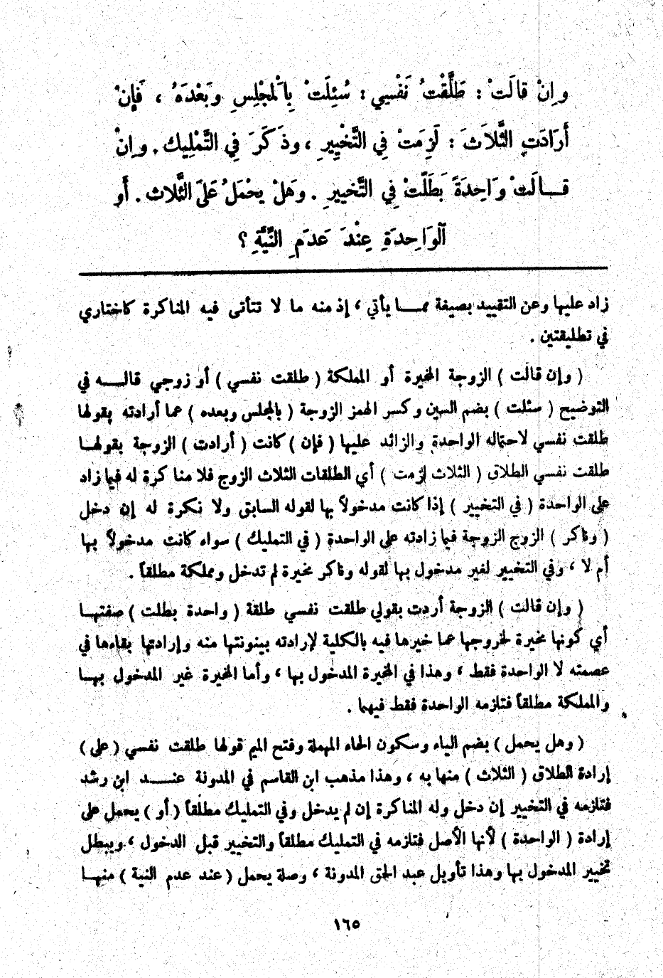 (وَهَلْ يُحْمَلُ) بِضَمِّ الْيَاءِ وَسُكُونِ الْحَاءِ الْمُهْمَلَةِ وَفَتْحِ الْمِيمِ قَوْلُهَا طَلَّقْت نَفْسِي (عَلَى) إرَادَةِ الطَّلَاقِ (الثَّلَاثِ) مِنْهَا بِهِ، وَهَذَا مَذْهَبُ ابْنِ الْقَاسِمِ فِي الْمُدَوَّنَةِ عِنْدَ ابْنِ رُشْدٍ فَتَلْزَمُهُ فِي التَّخْيِيرِ إنْ دَخَلَ وَلَهُ الْمُنَاكَرَةُ إنْ لَمْ يَدْخُلْ وَفِي التَّمْلِيكِ مُطْلَقًا (أَوْ) يُحْمَلُ عَلَى إرَادَةِ (الْوَاحِدَةِ) لِأَنَّهَا الْأَصْلُ فَتَلْزَمُهُ فِي التَّمْلِيكِ مُطْلَقًا وَالتَّخْيِيرِ قَبْلَ الدُّخُولِ، وَيَبْطُلُ تَخْيِيرُ الْمَدْخُولِ بِهَا وَهَذَا تَأْوِيلُ عَبْدِ الْحَقِّ الْمُدَوَّنَةَ، وَصِلَةُ يُحْمَلُ (عِنْدَ عَدَمِ النِّيَّةِ) مِنْهَا