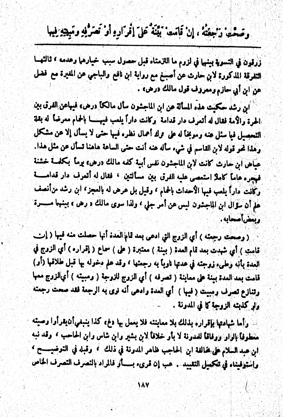 ابْنُ رُشْدٍ حُكِيَتْ هَذِهِ. الْمَسْأَلَةُ عَنْ ابْنِ الْمَاجِشُونِ سَأَلَ مَالِكًا " - رَضِيَ اللَّهُ عَنْهُ - " فِيهَا عَنْ الْفَرْقِ بَيْنَ الْحُرَّةِ وَالْأَمَةِ فَقَالَ لَهُ: أَتَعْرِفُ دَارَ قُدَامَةَ وَكَانَتْ دَارًا يُلْعَبُ فِيهَا بِالْحَمَامِ مُعَرِّضًا لَهُ بِقِلَّةِ التَّحْصِيلِ فِيمَا سُئِلَ عَنْهُ وَمُوَبِّخًا لَهُ عَلَى تَرْكِ أَعْمَالٍ نَظَرَهُ فِيهَا حَتَّى لَا يَسْأَلَ إلَّا عَنْ مُشْكِلٍ وَهَذَا نَحْوُ قَوْلِهِ لِابْنِ الْقَاسِمِ فِي شَيْءٍ سَأَلَهُ عَنْهُ أَنْتَ حَتَّى السَّاعَةِ هَاهُنَا تَسْأَلُ عَنْ مِثْلِ هَذَا. عِيَاضُ بْنُ حَارِثٍ كَانَتْ لِابْنِ الْمَاجِشُونِ نَفْسٌ أَبِيَّةٌ كَلَّمَهُ مَالِكٍ " - رَضِيَ اللَّهُ عَنْهُ - " يَوْمًا بِكَلِمَةٍ خَشِنَةٍ فَهَجَرَهُ عَامًا كَامِلًا اسْتَعْصَى عَلَيْهِ الْفَرْقُ بَيْنَ مَسْأَلَتَيْنِ، فَقَالَ لَهُ: أَتَعْرِفُ دَارَ قُدَامَةَ وَكَانَتْ دَارًا يَلْعَبُ فِيهَا الْأَحْدَاثُ بِالْحَمَامِ، وَقِيلَ: بَلْ عَرَّضَ لَهُ بِالْعَجْزِ ابْنُ رُشْدٍ مَنْ أَنْصَفَ عَلِمَ أَنَّ سُؤَالَ ابْنِ الْمَاجِشُونِ لَيْسَ عَنْ أَمْرٍ جَلِيٍّ، وَلِذَا سَوَّى مَالِكٌ " - رَضِيَ اللَّهُ عَنْهُ - " بَيْنَهُمَا مَرَّةً وَبَعْضُ أَصْحَابِهِ.