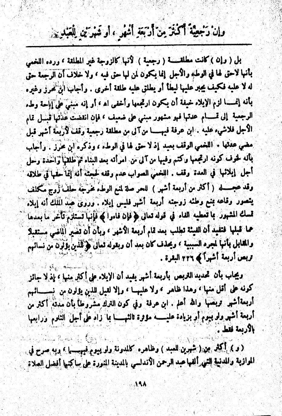 وَرَوَى عَبْدُ الْمَلِكِ أَنَّهُ إيلَاءٌ تَمَسُّكَ الْمَشْهُورِ بِمَا تُعْطِيهِ الْفَاءُ فِي قَوْله تَعَالَى {فَإِنْ فَاءُوا} [البقرة: 226] فَإِنَّهَا تَسْتَلْزِمُ تَأَخُّرَ مَا بَعْدَهَا عَمَّا قَبْلَهَا فَتُفِيدُ أَنَّ الْفَيْئَةَ تُطْلَبُ بَعْدَ تَمَامِ أَرْبَعَةِ الْأَشْهُرِ، وَبِأَنْ أَنْ تُصَيِّرَ الْمَاضِيَ مُسْتَقْبَلًا وَالْمُقَابِلُ بِأَنَّهَا لِمُجَرَّدِ السَّبَبِيَّةِ، وَيُحْذَفُ " كَانَ " بَعْدَ أَنْ وَبِقَوْلِهِ تَعَالَى {لِلَّذِينَ يُؤْلُونَ مِنْ نِسَائِهِمْ تَرَبُّصُ أَرْبَعَةِ أَشْهُرٍ} [البقرة: 226] .