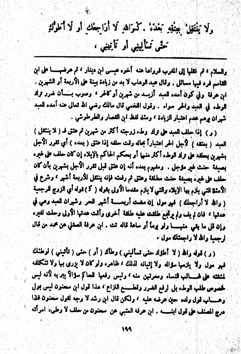 ـــــــــــــــــــــــــــــQوَالسَّلَامِ ثُمَّ نَقَلَهَا إلَى الْمَغْرِبِ فَرَوَاهَا عَنْهُ أَخُوهُ عِيسَى بْنُ دِينَارٍ، ثُمَّ عَرَضَهَا عَلَى ابْنِ الْقَاسِمِ فَرَدَّ فِيهَا مَسَائِلَ. وَقَالَ عَبْدُ الْوَهَّابِ " لَا بُدَّ مِنْ زِيَادَةِ بَيِّنَةٍ عَلَى الْأَرْبَعَةِ أَوْ الشَّهْرَيْنِ. ابْنُ عَرَفَةَ. وَفِي كَوْنِ أَمَدِهِ لِلْعَبْدِ أَزْيَدَ مِنْ شَهْرَيْنِ أَوْ كَالْحُرِّ، وَصُوِّبَ بِأَنَّ ضَرَرَ تَرْكِ الْوَطْءِ فِي الْعَبْدِ وَالْحُرِّ سَوَاءٌ. وَقَوْلُ اللَّخْمِيِّ قَالَ مَالِكٌ - رَضِيَ اللَّهُ تَعَالَى عَنْهُ - أَمَدُهُ لِلْعَبْدِ شَهْرَانِ يُوهِمُ عَدَمَ اعْتِبَارِ الزِّيَادَةِ، وَمِثْلُهُ لَفْظُ ابْنِ الْقَصَّارِ وَالطُّرْطُوشِيِّ.