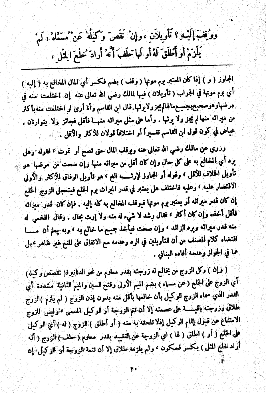 وَرُوِيَ عَنْ مَالِكٍ - رَضِيَ اللَّهُ تَعَالَى عَنْهُ - وَيُوقَفُ الْمَالُ حَتَّى تَصِحَّ أَوْ تَمُوتَ، فَقَوْلُهُ وَهَلْ يُرَدُّ أَيْ الْمُخَالَعُ بِهِ عَلَى كُلِّ حَالٍ، وَإِنْ كَانَ أَقَلَّ مِنْ مِيرَاثِهِ مِنْهَا، وَإِنْ صَحَّتْ مِنْ مَرَضِهَا هُوَ تَأْوِيلُ الْخِلَافِ لِلْأَقَلِّ، وَقَوْلُهُ، أَوْ الْمُجَاوِزُ لِإِرْثِهِ إلَخْ، هُوَ تَأْوِيلُ الْوِفَاقِ لِلْأَكْثَرِ وَالْأَوْلَى الِاقْتِصَارُ عَلَيْهِ، وَعَلَيْهِ فَاخْتُلِفَ هَلْ يُعْتَبَرُ فِي قَدْرِ الْمِيرَاثِ يَوْمُ الْخُلْعِ فَيَتَعَجَّلُ الزَّوْجُ الْخُلْعَ إنْ كَانَ قَدْرَ مِيرَاثِهِ، أَوْ يُعْتَبَرُ يَوْمُ مَوْتِهَا فَيُوقَفُ الْمُخَالَعُ بِهِ كُلُّهُ إلَيْهِ. فَإِنْ كَانَ قَدْرَ مِيرَاثِهِ فَأَقَلَّ أَخَذَهُ، وَإِنْ كَانَ أَكْثَرَ، فَقَالَ ابْن رُشْدٌ لَا شَيْءَ لَهُ مِنْهُ وَلَا إرْثَ بِحَالٍ. وَقَالَ اللَّخْمِيُّ لَهُ مِنْهُ قَدْرُ مِيرَاثِهِ وَيَرُدُّ الزَّائِدَ، وَإِنْ صَحَّتْ فَيَأْخُذُ جَمِيعَ مَا خَالَعَ بِهِ، وَبِهِ يُعْلَمُ أَنَّ مَا اقْتَضَاهُ كَلَامُ الْمُصَنِّفِ مِنْ أَنَّ التَّأْوِيلَيْنِ فِي الرَّدِّ وَعَدَمِهِ مَعَ الِاتِّفَاقِ عَلَى الْمَنْعِ غَيْرُ ظَاهِرٍ، بَلْ هُمَا فِي الْجَوَازِ وَعَدَمِهِ أَفَادَهُ الْبُنَانِيُّ.
