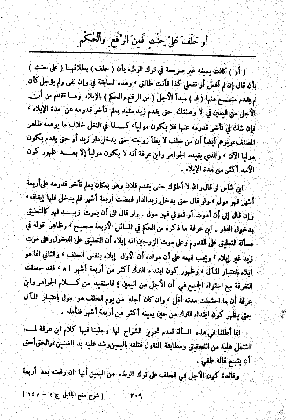 إنَّمَا أَطَلْنَا فِي هَذِهِ الْمَسْأَلَةِ لِعَدَمِ تَحْرِيرِ الشُّرَّاحِ لَهَا وَجَلَبْنَا فِيهَا كَلَامَ ابْنِ عَرَفَةَ لِمَا اشْتَمَلَ عَلَيْهِ مِنْ التَّحْقِيقِ وَمُطَابَقَةِ الْمَنْقُولِ فَتَلَقَّهُ بِالْيَمِينِ وَشُدَّ عَلَيْهِ يَدَ الضَّنِينِ، وَالْحَقُّ أَحَقُّ أَنْ يُتَّبَعَ قَالَهُ طفي. وَفَائِدَةُ كَوْنِ الْأَجَلِ فِي الْحَلِفِ عَلَى تَرْكِ الْوَطْءِ مِنْ الْيَمِينِ أَنَّهَا إنْ رَفَعَتْهُ بَعْدَ أَرْبَعَةِ