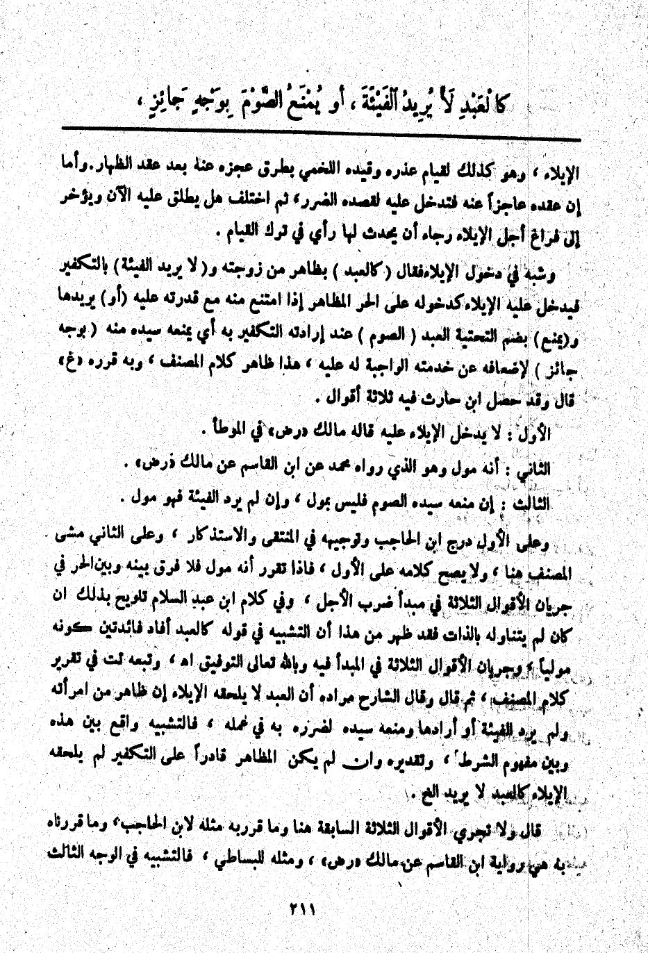 الثَّالِثُ: إنْ مَنَعَهُ سَيِّدُهُ الصَّوْمَ فَلَيْسَ بِمُؤْلٍ، وَإِنْ لَمْ يُرِدْ الْفَيْئَةَ فَهُوَ مُؤْلٍ. وَعَلَى الْأَوَّلِ دَرَجَ ابْنُ الْحَاجِبِ وَتَوْجِيهُهُ فِي الْمُنْتَقَى وَالِاسْتِذْكَارِ، وَعَلَى الثَّانِي مَشَى الْمُصَنِّفُ هُنَا، وَلَا يَصِحُّ كَلَامُهُ عَلَى الْأَوَّلِ، فَإِذَا تَقَرَّرَ أَنَّهُ مُؤْلٍ فَلَا فَرْقَ بَيْنَهُ وَبَيْنَ الْحُرِّ فِي جَرَيَانِ الْأَقْوَالِ الثَّلَاثَةِ فِي مَبْدَأِ ضَرْبِ الْأَجَلِ، وَفِي كَلَامِ ابْنِ عَبْدِ السَّلَامِ تَلْوِيحٌ بِذَلِكَ إنْ كَانَ لَمْ يَتَنَاوَلْهُ بِالذَّاتِ فَقَدْ ظَهَرَ مِنْ هَذَا أَنَّ التَّشْبِيهَ فِي قَوْلِهِ كَالْعَبْدِ أَفَادَ فَائِدَتَيْنِ كَوْنَهُ مُؤْلِيًا، وَجَرَيَانَ الْأَقْوَالِ الثَّلَاثَةِ فِي الْمَبْدَأِ فِيهِ وَبِاَللَّهِ تَعَالَى التَّوْفِيقُ اهـ.