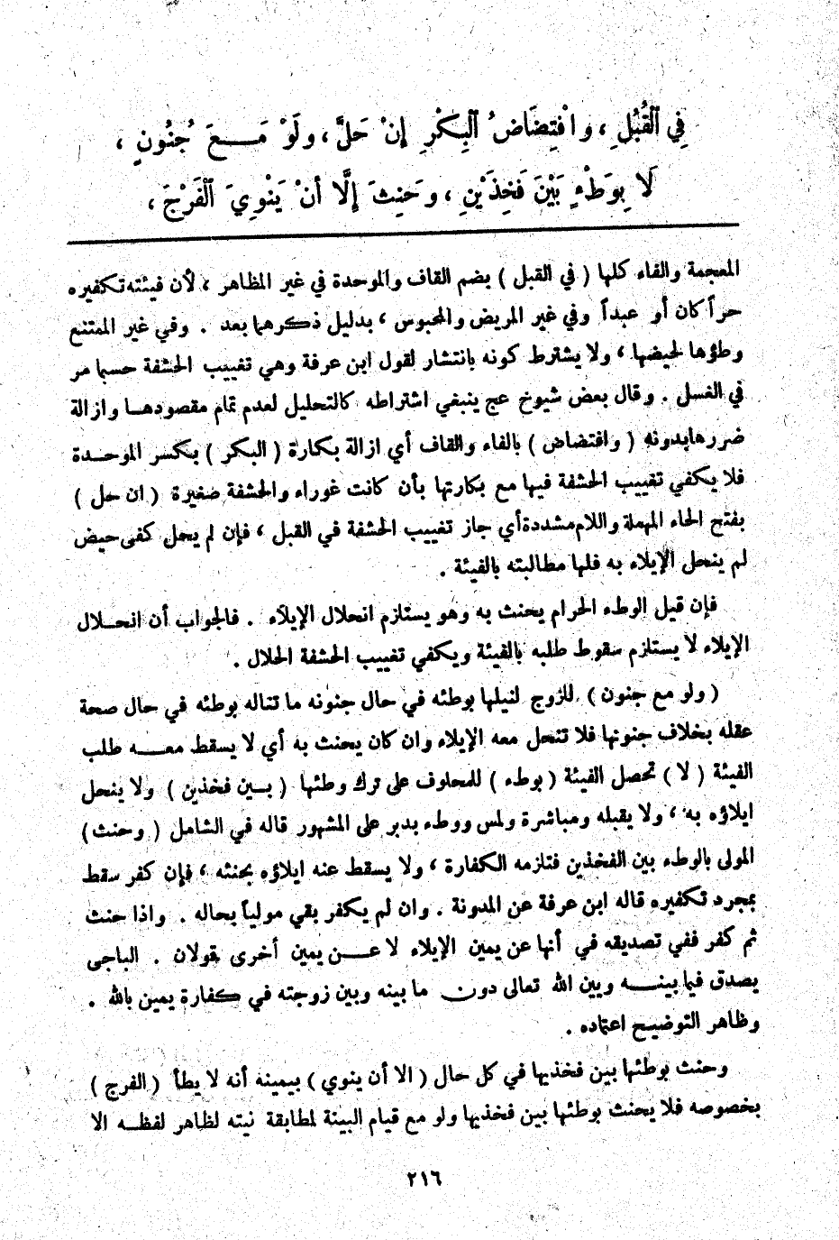 ـــــــــــــــــــــــــــــQالْمُعْجَمَةِ وَالْفَاءِ كُلِّهَا (فِي الْقُبُلِ) بِضَمِّ الْقَافِ وَالْمُوَحَّدَةِ فِي غَيْرِ الْمُظَاهِرِ لِأَنَّ فَيْئَتَهُ تَكْفِيرُهُ حُرًّا كَانَ أَوْ عَبْدًا وَفِي غَيْرِ الْمَرِيضِ وَالْمَحْبُوسِ، بِدَلِيلِ ذِكْرِهِمَا بَعْدُ. وَفِي غَيْرِ الْمُمْتَنِعِ وَطْؤُهَا لِحَيْضِهَا، وَلَا يُشْتَرَطُ كَوْنُهُ بِانْتِشَارٍ لِقَوْلِ ابْنِ عَرَفَةَ: وَهِيَ تَغْيِيبُ الْحَشَفَةِ حَسْبَمَا مَرَّ فِي الْغُسْلِ. وَقَالَ بَعْضُ شُيُوخِ عج: يَنْبَغِي اشْتِرَاطُهُ كَالتَّحْلِيلِ لِعَدَمِ تَمَامِ مَقْصُودِهَا وَإِزَالَةِ ضَرَرِهَا بِدُونِهِ (وَافْتِضَاضُ) بِالْفَاءِ وَالْقَافِ أَيْ إزَالَةُ بَكَارَةِ (الْبِكْرِ) بِكَسْرِ الْمُوَحَّدَةِ فَلَا يَكْفِي تَغْيِيبُ الْحَشَفَةِ فِيهَا مَعَ بَكَارَتِهَا بِأَنْ كَانَتْ غَوْرَاءَ وَالْحَشَفَةُ صَغِيرَةً (إنْ حَلَّ) بِفَتْحِ الْحَاءِ الْمُهْمَلَةِ وَاللَّامُ مُشَدَّدَةٌ أَيْ جَازَ تَغْيِيبُ الْحَشَفَةِ فِي الْقُبُلِ، فَإِنْ لَمْ يَحِلَّ كَفَى حَيْضٌ لِمَا يَنْحَلُّ الْإِيلَاءُ بِهِ فَلَهَا مُطَالَبَتُهُ بِالْفَيْئَةِ.