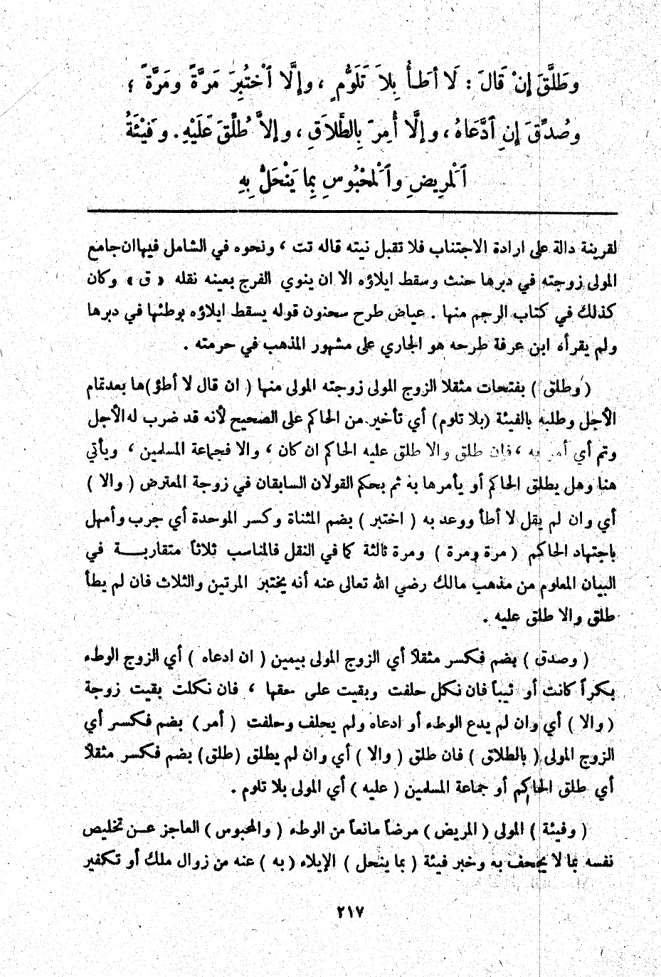 (وَطَلَّقَ) بِفَتَحَاتٍ مُثَقَّلًا الزَّوْجُ الْمُؤْلِي زَوْجَتَهُ الْمُؤْلَى مِنْهَا (إنْ قَالَ لَا أَطَؤُ) هَا بَعْدَ تَمَامِ الْأَجَلِ وَطَلَبِهِ بِالْفَيْئَةِ (بِلَا تَلَوُّمٍ) أَيْ تَأْخِيرٍ مِنْ الْحَاكِمِ عَلَى الصَّحِيحِ لِأَنَّهُ قَدْ ضُرِبَ لَهُ الْأَجَلُ وَتَمَّ أَيْ أُمِرَ بِهِ، فَإِنْ طَلَّقَ وَإِلَّا طَلَّقَ عَلَيْهِ الْحَاكِمُ إنْ كَانَ، وَإِلَّا فَجَمَاعَةُ الْمُسْلِمِينَ، وَيَأْتِي هُنَا وَهَلْ يُطَلِّقُ الْحَاكِمُ أَوْ يَأْمُرُهَا بِهِ ثُمَّ بِحُكْمِ الْقَوْلَيْنِ السَّابِقِينَ فِي زَوْجَةِ الْمُعْتَرِضِ (وَإِلَّا) أَيْ وَإِنْ لَمْ يَقُلْ لَا أَطَأُ وَوَعَدَ بِهِ (اُخْتُبِرَ) بِضَمِّ الْمُثَنَّاةِ وَكَسْرِ الْمُوَحَّدَةِ أَيْ جُرِّبَ وَأُمْهِلَ بِاجْتِهَادِ الْحَاكِمِ (مَرَّةً وَمَرَّةً) وَمَرَّةً ثَالِثَةً كَمَا فِي النَّقْلِ فَالْمُنَاسِبُ ثَلَاثًا مُتَقَارِبَةً فِي الْبَيَانِ الْمَعْلُومِ مِنْ مَذْهَبِ مَالِكٍ - رَضِيَ اللَّهُ تَعَالَى عَنْهُ - أَنَّهُ يُخْتَبَرُ الْمَرَّتَيْنِ وَالثَّلَاثَ فَإِنْ لَمْ يَطَأْ طَلَّقَ وَإِلَّا طُلِّقَ عَلَيْهِ.