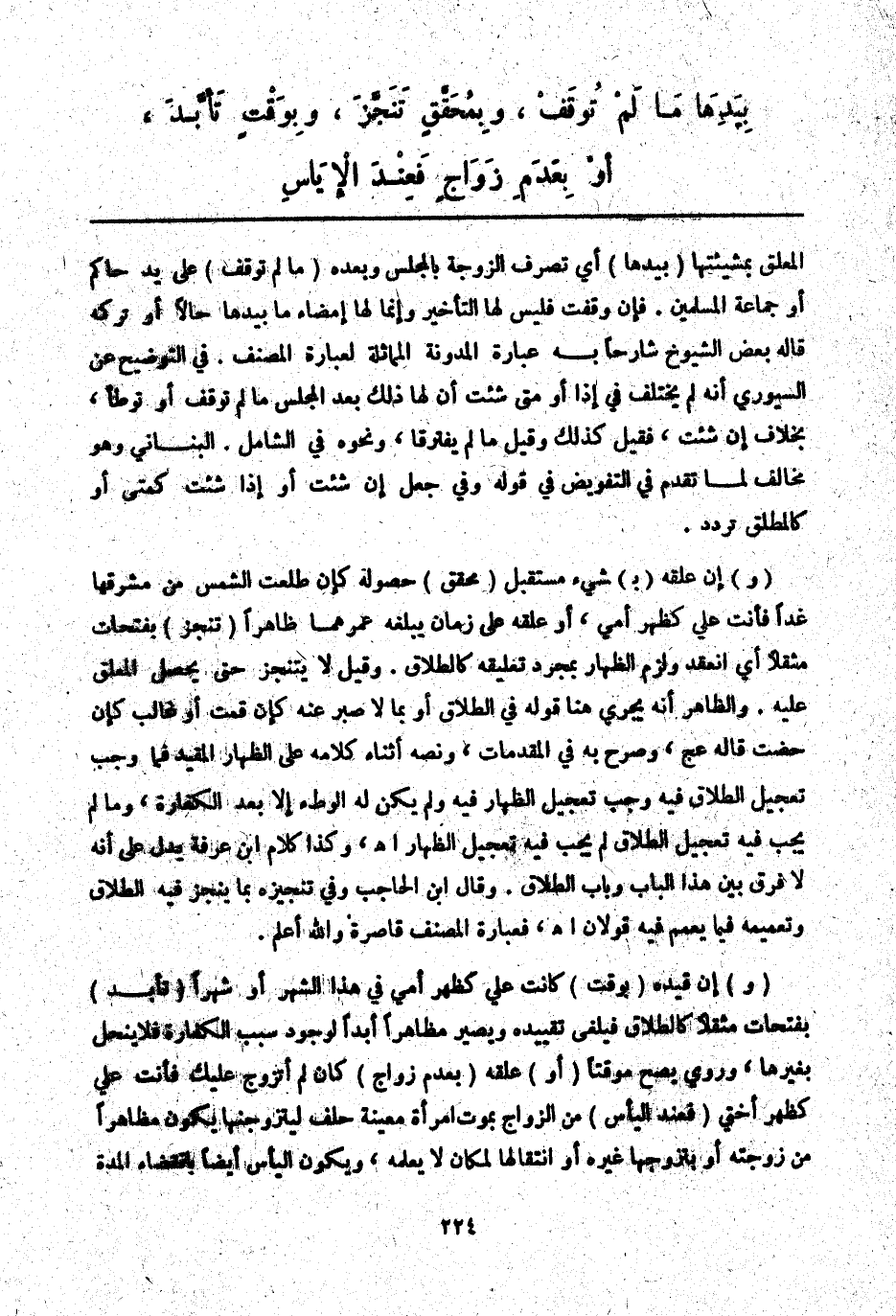 ـــــــــــــــــــــــــــــQالْمُعَلَّقُ بِمَشِيئَتِهَا (بِيَدِهَا) أَيْ تُصْرَفُ الزَّوْجَةُ بِالْمَجْلِسِ وَبَعْدَهُ (مَا لَمْ تُوقَفْ) عَلَى يَدِ حَاكِمٍ أَوْ جَمَاعَةِ الْمُسْلِمِينَ. فَإِنْ وَقَفَتْ فَلَيْسَ لَهَا التَّأْخِيرُ وَإِنَّمَا لَهَا إمْضَاءُ مَا بِيَدِهَا حَالًّا أَوْ تَرْكُهُ قَالَ بَعْضُ الشُّيُوخِ شَارِحًا بِهِ عِبَارَةَ الْمُدَوَّنَةِ الْمُمَاثِلَةَ لِعِبَارَةِ الْمُصَنِّفِ. فِي التَّوْضِيحِ عَنْ السُّيُورِيِّ أَنَّهُ لَمْ يَخْتَلِفْ فِي إذَا أَوْ مَتَى شِئْتِ أَنَّ لَهَا ذَلِكَ بَعْدَ الْمَجْلِسِ مَا لَمْ تُوقَفْ أَوْ تُوطَأْ، بِخِلَافِ إنْ شِئْتِ، فَقِيلَ كَذَلِكَ وَقِيلَ مَا لَمْ يَفْتَرِقَا، وَنَحْوَهُ فِي الشَّامِلِ. الْبُنَانِيَّ وَهُوَ مُخَالِفٌ لِمَا تَقَدَّمَ فِي التَّفْوِيضِ فِي قَوْلِهِ وَفِي جَعْلِ إنْ شِئْتَ أَوْ إذَا كَمَتَى أَوْ كَالْمُطْلَقِ تَرَدُّدٌ.