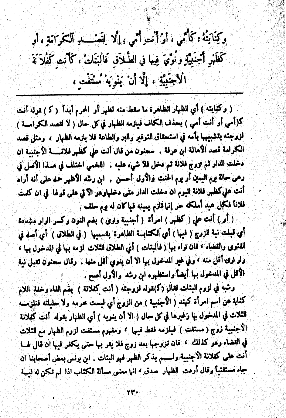 (أَوْ) أَنْتِ عَلَيَّ (كَظَهْرِ) امْرَأَةٍ (أَجْنَبِيَّةٍ وَنُوِّيَ) بِضَمِّ النُّونِ وَكَسْرِ الْوَاوِ مُشَدَّدَةً أَيْ قَبِلَتْ نِيَّةَ الزَّوْجِ (فِيهَا) أَيْ الْكِتَابَةِ الظَّاهِرَةِ بِقِسْمَيْهَا (فِي الطَّلَاقِ) أَيْ أَصْلُهُ فِي الْفَتْوَى وَالْقَضَاءِ، فَإِنْ نَوَاهُ بِهَا (فَالْبَتَاتُ) أَيْ الطَّلَاقُ الثَّلَاثُ لَزِمَهُ بِهَا فِي الْمَدْخُولِ بِهَا، وَلَوْ نَوَى أَقَلَّ مِنْهُ، وَفِي غَيْرِ الْمَدْخُولِ بِهَا إلَّا أَنْ يَنْوِيَ أَقَلَّ مِنْهَا. وَقَالَ سَحْنُونٌ: تُقْبَلُ نِيَّةُ الْأَقَلِّ فِي الْمَدْخُولِ بِهَا أَيْضًا وَاسْتَظْهَرَهُ ابْنُ رُشْدٍ وَالْأَوَّلُ أَصَحُّ.
