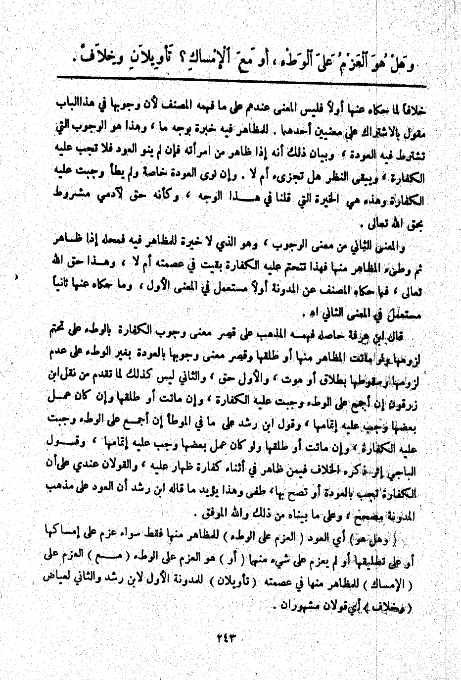 وَهَلْ هُوَ الْعَزْمُ عَلَى الْوَطْءِ، أَوْ مَعَ الْإِمْسَاكِ؟ تَأْوِيلَانِ وَخِلَافٌ.