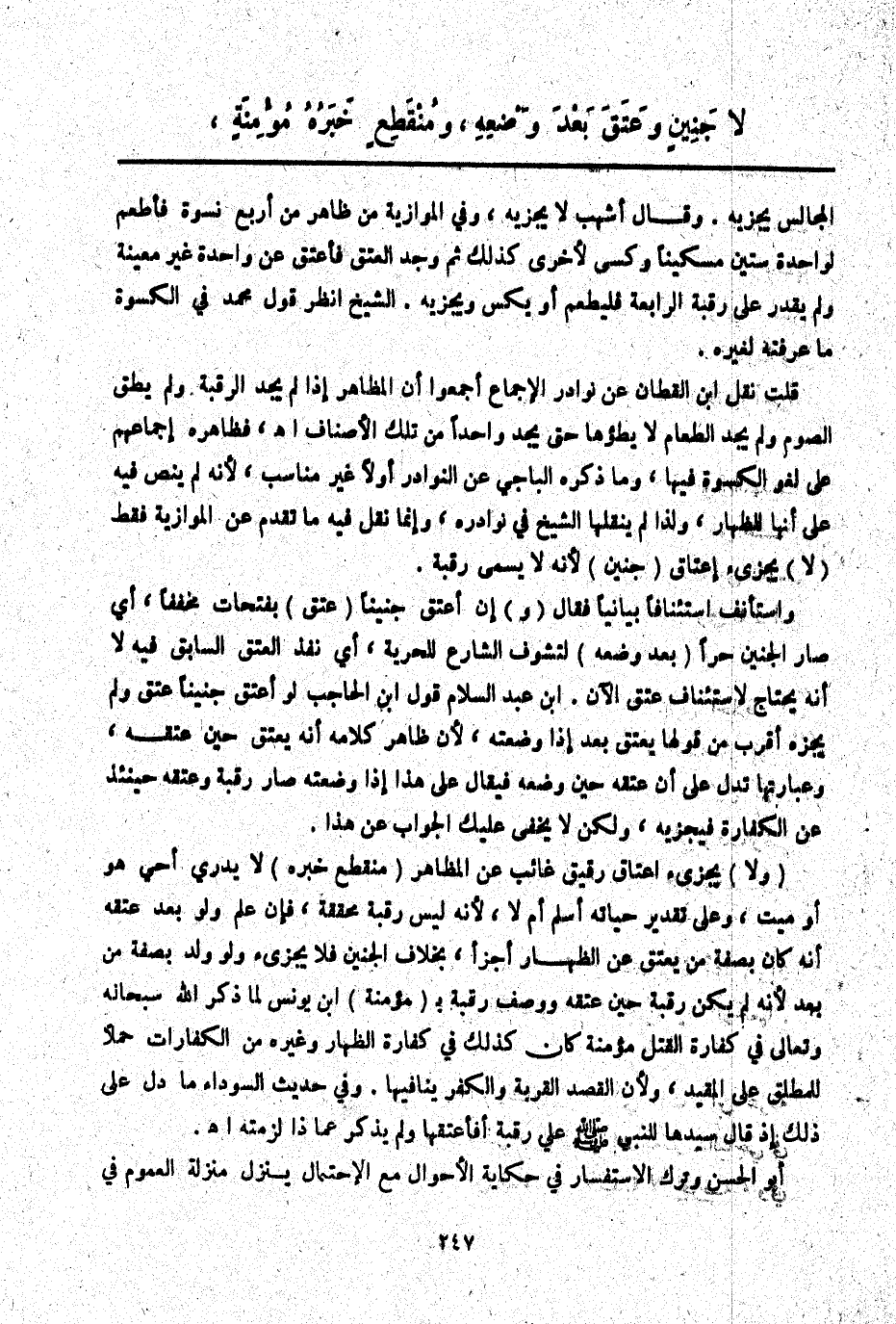 (وَلَا) يُجْزِئُ إعْتَاقُ رَقِيقٍ غَائِبٍ عَنْ الْمُظَاهِرِ (مُنْقَطِعٍ خَبَرُهُ) لَا يَدْرِي أَحَيٌّ هُوَ أَوْ مَيِّتٌ، وَعَلَى تَقْدِيرِ حَيَاتِهِ أَسْلَمَ أَمْ لَا لِأَنَّهُ لَيْسَ رَقَبَةً مُحَقَّقَةً، فَإِنْ عَلِمَ وَلَوْ بَعْدَ عِتْقِهِ أَنَّهُ كَانَ بِصِفَةِ مَنْ يُعْتَقُ عَنْ الظِّهَارِ أَجْزَأَ، بِخِلَافِ الْجَنِينِ فَلَا يُجْزِئُ وَلَوْ وُلِدَ بِصِفَةِ مَنْ بَعُدَ لِأَنَّهُ لَمْ يَكُنْ رَقَبَةً حِينَ عِتْقِهِ وَوَصْفُ رَقَبَةٍ بِ (مُؤْمِنَةٍ) ابْنُ يُونُسَ لَمَّا ذَكَرَ اللَّهُ سُبْحَانَهُ وَتَعَالَى فِي كَفَّارَةِ الْقَتْلِ مُؤْمِنَةً كَانَ كَذَلِكَ فِي كَفَّارَةِ الظِّهَارِ وَغَيْرِهِ مِنْ الْكَفَّارَاتِ حَمْلًا لِلْمُطْلَقِ عَلَى الْمُقَيَّدِ وَلِأَنَّ الْقَصْدَ الْقُرْبَةُ وَالْكُفْرُ يُنَافِيهَا. وَفِي حَدِيثِ السَّوْدَاءِ مَا دَلَّ عَلَى ذَلِكَ إذْ قَالَ سَيِّدُهَا لِلنَّبِيِّ - صَلَّى اللَّهُ عَلَيْهِ وَسَلَّمَ - عَلَيَّ رَقَبَةٍ أَفَأَعْتِقُهَا وَلَمْ يَذْكُرْ إذَا لَزِمَتْهُ اهـ. أَبُو الْحَسَنِ وَتَرْكُ الِاسْتِفْسَارِ فِي حِكَايَةِ الْأَحْوَالِ مَعَ الِاحْتِمَالِ يَنْزِلُ مَنْزِلَةَ الْعُمُومِ فِي