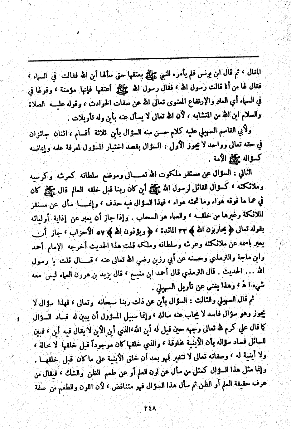 ثُمَّ قَالَ السُّهَيْلِيُّ وَالثَّالِثُ: السُّؤَالُ بِأَيْنَ عَنْ ذَاتِ رَبِّنَا سُبْحَانَهُ وَتَعَالَى، فَهَذَا سُؤَالٌ لَا يَجُوزُ وَهُوَ سُؤَالٌ فَاسِدٌ لَا يُجَابُ عَنْهُ سَائِلُهُ، وَإِنَّمَا سَبِيلُ الْمَسْئُولِ أَنْ يُبَيِّنَ لَهُ فَسَادَ السُّؤَالِ كَمَا قَالَ عَلِيٌّ كَرَّمَ اللَّهُ تَعَالَى وَجْهَهُ حِين قِيلَ لَهُ: أَيْنَ اللَّهُ الَّذِي أَيْنَ الْأَيْنُ لَا يُقَالُ فِيهِ أَيْنَ؟ فَبَيَّنَ لِلسَّائِلِ فَسَادَ سُؤَالِهِ بِأَنَّ الْأَيْنِيَّةَ مَخْلُوقَةٌ، وَاَلَّذِي خَلَقَهَا كَانَ مَوْجُودًا قَبْلَ خَلْقِهَا لَا مَحَالَةَ، وَلَا أَيْنِيَّةَ لَهُ، وَصِفَاتُهُ تَعَالَى لَا تَتَغَيَّرُ فَهُوَ بَعْدَ أَنْ خَلَقَ الْأَيْنِيَّةَ عَلَى مَا كَانَ قَبْلَ خَلْقِهَا. وَإِنَّمَا مَثَلُ هَذَا السُّؤَالِ كَمَثَلِ مَنْ سَأَلَ عَنْ لَوْنِ الْعِلْمِ أَوْ عَنْ طَعْمِ الظَّنِّ وَالشَّكِّ، فَيُقَالُ مَنْ عَرَفَ حَقِيقَةَ الْعِلْمِ أَوْ الظَّنِّ ثُمَّ سَأَلَ هَذَا السُّؤَالَ فَهُوَ مُتَنَاقِضٌ لِأَنَّ اللَّوْنَ وَالطَّعْمَ مِنْ صِفَةِ