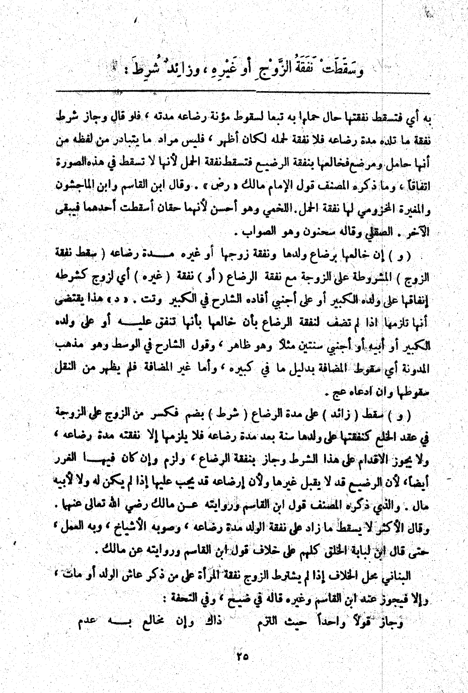 (وَ) سَقَطَ (زَائِدٌ) عَلَى مُدَّةِ الرَّضَاعِ (شُرِطَ) بِضَمٍّ فَكَسْرٍ مِنْ الزَّوْجِ عَلَى الزَّوْجَةِ فِي عَقْدِ الْخُلْعِ كَنَفَقَتِهَا عَلَى وَلَدِهَا سَنَةً بَعْدَ مُدَّةِ رَضَاعِهِ فَلَا يَلْزَمُهَا إلَّا نَفَقَتُهُ مُدَّةَ رَضَاعِهِ، وَلَا يَجُوزُ الْإِقْدَامُ عَلَى هَذَا الشَّرْطِ وَجَازَ بِنَفَقَةِ الرَّضَاعِ، وَلَزِمَ، وَإِنْ كَانَ فِيهَا الْغَرَرُ أَيْضًا؛ لِأَنَّ الرَّضِيعَ قَدْ لَا يَقْبَلُ غَيْرَهَا وَلِأَنَّ إرْضَاعَهُ قَدْ يَجِبُ عَلَيْهَا إذَا لَمْ يَكُنْ لَهُ وَلَا لِأَبِيهِ مَالٌ. وَاَلَّذِي ذَكَرَهُ الْمُصَنِّفُ قَوْلُ ابْنِ الْقَاسِمِ وَرِوَايَتُهُ عَنْ مَالِكٍ - رَضِيَ اللَّهُ تَعَالَى عَنْهُمَا -.