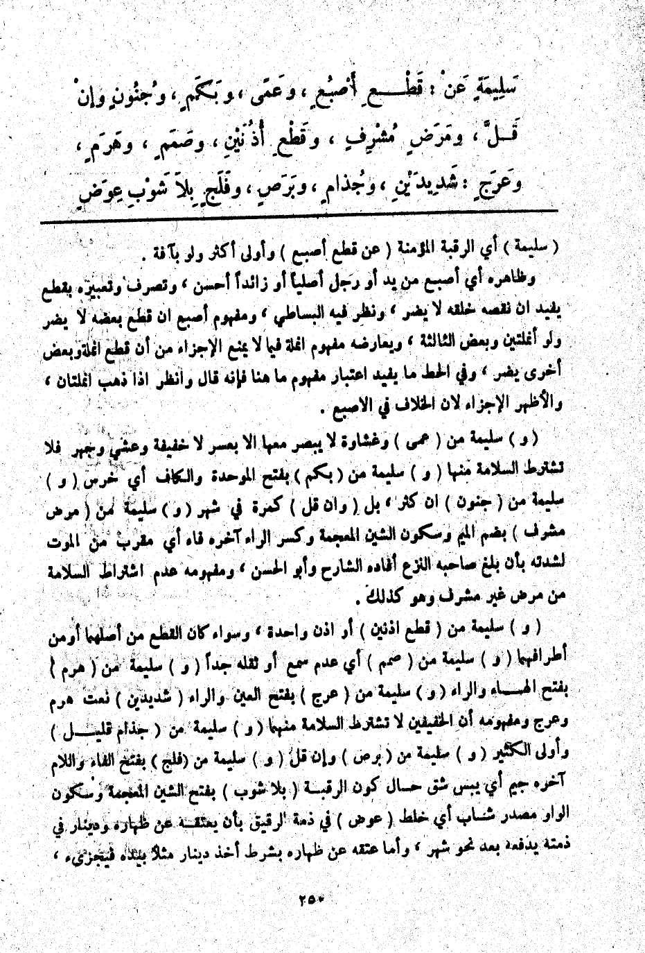 (وَ) سَلِيمَةٍ مِنْ (قَطْعِ أُذُنَيْنِ) أَوْ أُذُنٍ وَاحِدَةٍ، وَسَوَاءٌ كَانَ الْقَطْعُ مِنْ أَصْلِهِمَا أَوْ مِنْ أَطْرَافِهِمَا (وَ) سَلِيمَةٍ مِنْ (صَمَمٍ) أَيْ عَدَمِ سَمْعٍ أَوْ ثِقَلِهِ جِدًّا (وَ) سَلِيمَةٍ مِنْ (هَرَمٍ) بِفَتْحِ الْهَاءِ وَالرَّاءِ (وَ) سَلِيمَةٍ مِنْ (عَرَجٍ) بِفَتْحِ الْعَيْنِ وَالرَّاءِ (شَدِيدَيْنِ) نَعْتُ هَرَمٍ وَعَرَجٍ وَمَفْهُومُهُ أَنَّ الْخَفِيفَيْنِ لَا تُشْتَرَطُ السَّلَامَةُ مِنْهُمَا (وَ) سَلِيمَةٍ مِنْ (جُذَامٍ قَلِيلٍ) وَأَوْلَى الْكَثِيرُ (وَ) سَلِيمَةٍ مِنْ (بَرَصٍ) وَإِنْ قَلَّ (وَ) سَلِيمَةٍ مِنْ (فَلَجٍ) بِفَتْحِ الْفَاءِ وَاللَّامِ آخِرُهُ جِيمٌ أَيْ يُبْسِ شَقٍّ حَالَ كَوْنِ الرَّقَبَةِ (بِلَا شَوْبِ) بِفَتْحِ الشِّينِ الْمُعْجَمَةِ وَسُكُونِ الْوَاوِ مَصْدَرُ شَابَ أَيْ خَلَطَ (عِوَضٍ) فِي ذِمَّةِ الرَّقِيقِ بِأَنْ يُعْتِقَهُ عَنْ ظِهَارِهِ وَدِينَارٍ فِي ذِمَّتِهِ يَدْفَعُهُ بَعْدَ نَحْوِ شَهْرٍ، وَأَمَّا عِتْقُهُ عَنْ ظِهَارِهِ بِشَرْطِ أَخْذِ دِينَارٍ مَثَلًا بِيَدِهِ فَيُجْزِئُ،