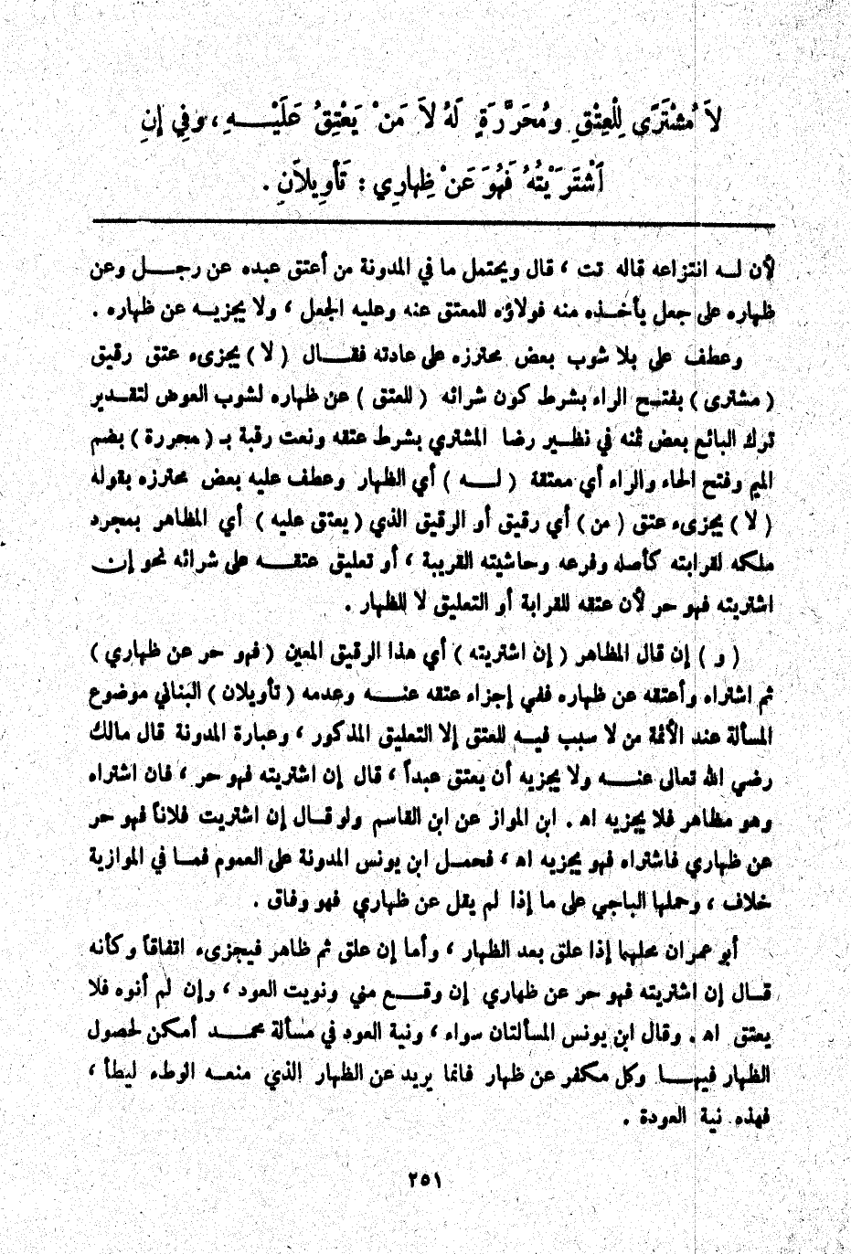 (وَ) إنْ قَالَ الْمُظَاهِرُ (إنْ اشْتَرَيْته) أَيْ هَذَا الرَّقِيقَ الْمُعَيَّنَ (فَهُوَ حُرٌّ عَنْ ظِهَارِي) ثُمَّ اشْتَرَاهُ وَأَعْتَقَهُ عَنْ ظِهَارِهِ فَفِي إجْزَاءِ عِتْقِهِ عَنْهُ وَعَدَمِهِ (تَأْوِيلَانِ) الْبُنَانِيُّ مَوْضُوعُ الْمَسْأَلَةِ عِنْدَ الْأَئِمَّةِ مَنْ لَا سَبَبَ فِيهِ لِلْعِتْقِ إلَّا التَّعْلِيقُ الْمَذْكُورُ، وَعِبَارَةُ الْمُدَوَّنَةِ قَالَ مَالِكٌ - رَضِيَ اللَّهُ تَعَالَى عَنْهُ - وَلَا يُجْزِيهِ أَنْ يُعْتِقَ عَبْدًا، قَالَ إنْ اشْتَرَيْته فَهُوَ حُرٌّ، فَإِنْ اشْتَرَاهُ وَهُوَ مُظَاهِرٌ فَلَا يُجْزِيهِ اهـ. ابْنُ الْمَوَّازِ عَنْ ابْنِ الْقَاسِمِ وَلَوْ قَالَ: إنْ اشْتَرَيْت فُلَانًا فَهُوَ حُرٌّ عَنْ ظِهَارِي فَاشْتَرَاهُ فَهُوَ يُجْزِيهِ. اهـ. فَحَمَلَ ابْنُ يُونُسَ الْمُدَوَّنَةَ عَلَى الْعُمُومِ فَمَا فِي الْمَوَّازِيَّةِ خِلَافٌ، وَحَمَلَهَا الْبَاجِيَّ عَلَى مَا إذَا لَمْ يَقُلْ عَنْ ظِهَارِي فَهُوَ وِفَاقٌ.