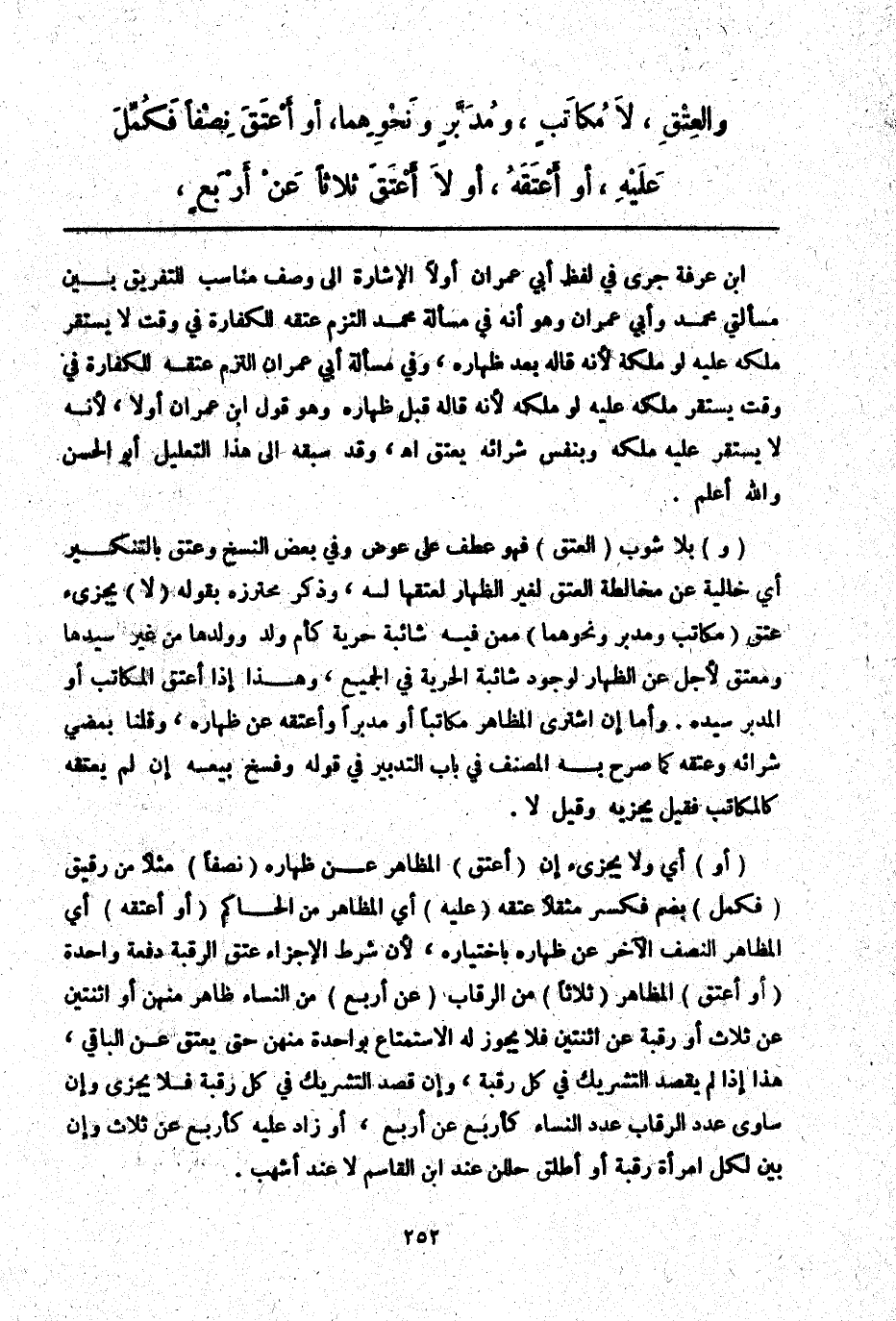 (أَوْ) أَيْ وَلَا يُجْزِئُ إنْ (أَعْتَقَ) الْمُظَاهِرُ عَنْ ظِهَارِهِ (نِصْفًا) مَثَلًا مِنْ رَقِيقٍ (فَكُمِّلَ) بِضَمٍّ فَكَسْرٍ مُثَقَّلًا عِتْقُهُ (عَلَيْهِ) أَيْ الْمُظَاهِرِ مِنْ الْحَاكِمِ (أَوْ أَعْتَقَهُ) أَيْ الْمُظَاهِرُ النِّصْفَ الْآخَرَ عَنْ ظِهَارِهِ بِاخْتِيَارِهِ لِأَنَّ شَرْطَ الْإِجْزَاءِ عِتْقُ الرَّقَبَةِ دَفْعَةً وَاحِدَةً (أَوْ أَعْتَقَ) الْمُظَاهِرُ (ثَلَاثًا) مِنْ الرِّقَابِ (عَنْ أَرْبَعٍ) مِنْ النِّسَاءِ ظَاهَرَ مِنْهُنَّ أَوْ اثْنَيْنِ عَنْ ثَلَاثٍ أَوْ رَقَبَةً عَنْ اثْنَتَيْنِ فَلَا يَجُوزُ لَهُ الِاسْتِمْتَاعُ بِوَاحِدَةٍ مِنْهُنَّ حَتَّى يُعْتِقَ عَنْ الْبَاقِي، هَذَا إذَا لَمْ يَقْصِدْ التَّشْرِيكَ فِي كُلِّ رَقَبَةٍ، وَإِنْ قَصَدَ التَّشْرِيكَ فِي كُلِّ رَقَبَةٍ فَلَا يُجْزِئُ وَإِنْ سَاوَى عَدَدُ الرِّقَابِ عَدَدَ النِّسَاءِ كَأَرْبَعٍ عَنْ أَرْبَعٍ، أَوْ زَادَ عَلَيْهِ كَأَرْبَعٍ عَنْ ثَلَاثٍ وَإِنْ بَيَّنَ لِكُلِّ امْرَأَةٍ رَقَبَةً أَوْ أَطْلَقَ حَلَلْنَ عِنْدَ ابْنِ الْقَاسِمِ لَا عِنْدَ أَشْهَبَ.