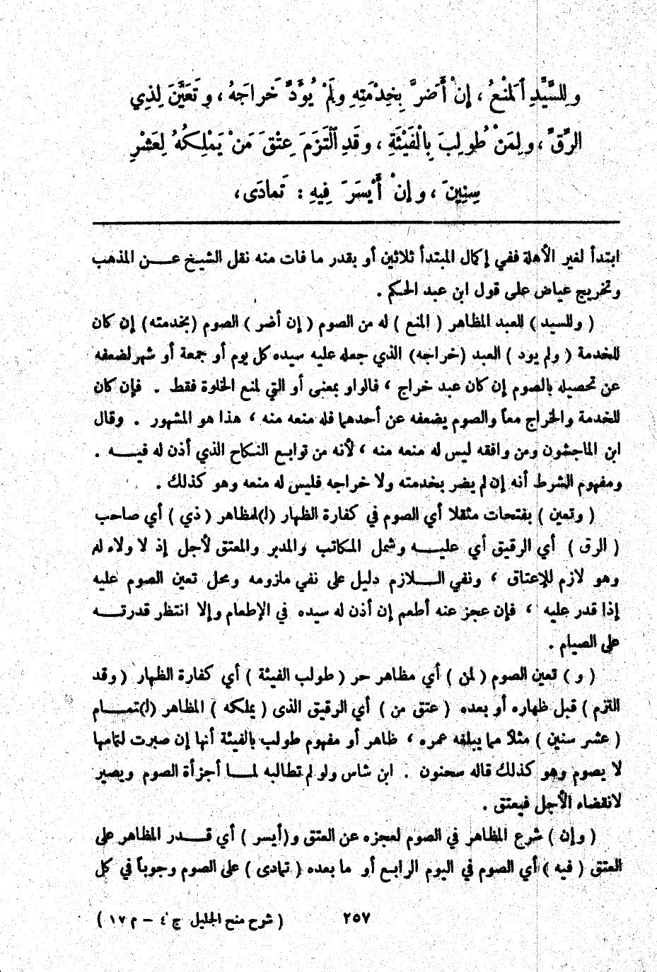 (وَلِلسَّيِّدِ) لِلْعَبْدِ الْمُظَاهِرِ (الْمَنْعُ) لَهُ مِنْ الصَّوْمِ (إنْ أَضَرَّ) الصَّوْمُ (بِخِدْمَتِهِ) إنْ كَانَ لِلْخِدْمَةِ (وَلَمْ يُؤَدِّ) الْعَبْدُ (خَرَاجَهُ) الَّذِي جَعَلَهُ عَلَيْهِ سَيِّدُهُ كُلَّ يَوْمٍ أَوْ جُمُعَةٍ أَوْ شَهْرٍ لِضَعْفِهِ عَنْ تَحْصِيلِهِ بِالصَّوْمِ إنْ كَانَ عَبْدَ خَرَاجٍ، فَالْوَاوُ بِمَعْنَى أَوْ الَّتِي لِمَنْعِ الْخَلْوَةِ فَقَطْ. فَإِنْ كَانَ لِلْخِدْمَةِ وَالْخَرَاجِ مَعًا وَالصَّوْمُ يُضْعِفُهُ عَنْ أَحَدِهِمَا فَلَهُ مَنْعُهُ مِنْهُ، هَذَا هُوَ الْمَشْهُورُ. وَقَالَ ابْنُ الْمَاجِشُونِ: وَمَنْ وَافَقَهُ لَيْسَ لَهُ مَنْعُهُ مِنْهُ لِأَنَّهُ مِنْ تَوَابِعِ النِّكَاحِ الَّذِي أَذِنَ لَهُ فِيهِ. وَمَفْهُومُ الشَّرْطِ أَنَّهُ إنْ لَمْ يَضُرَّ بِخِدْمَتِهِ وَلَا خَرَاجِهِ فَلَيْسَ لَهُ مَنْعُهُ وَهُوَ كَذَلِكَ.