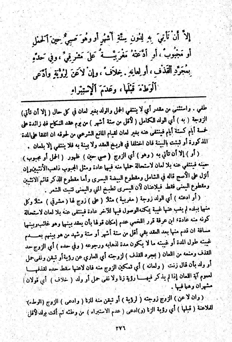 إلَّا أَنْ تَأْتِيَ بِهِ لِدُونِ سِتَّةِ أَشْهُرٍ أَوْ وَهُوَ صَبِيٌّ حِينَ الْحَمْلِ أَوْ مَجْبُوبٌ، أَوْ ادَّعَتْهُ مَغْرِبِيَّةٌ عَلَى مَشْرِقِيٍّ