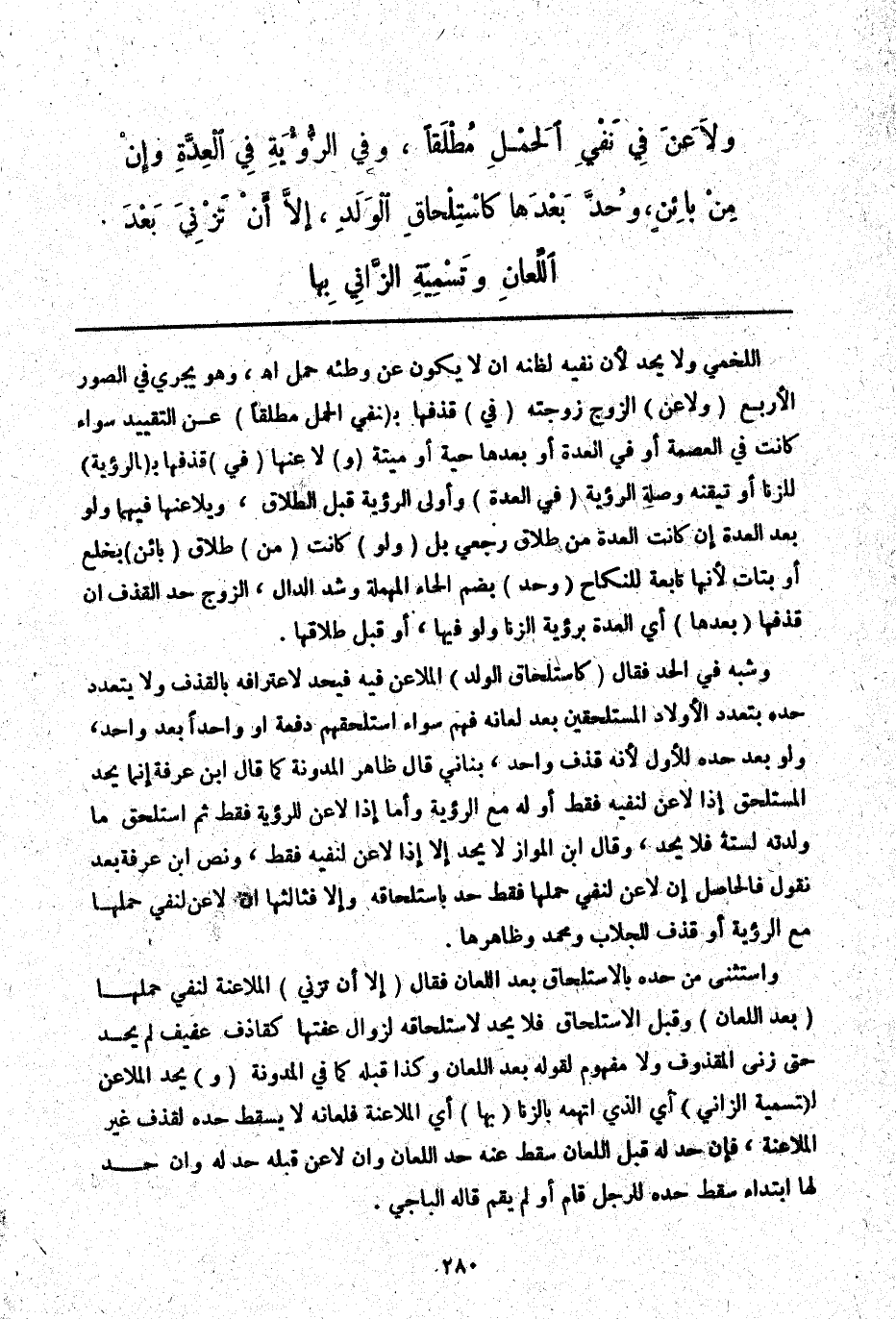 ـــــــــــــــــــــــــــــQاللَّخْمِيُّ وَلَا يُحَدُّ لِأَنَّ نَفْيَهُ لِظَنِّهِ أَنْ لَا يَكُونَ عَنْ وَطْئِهِ حَمْلٌ. اهـ. وَهُوَ يَجْرِي فِي الصُّوَرِ الْأَرْبَعِ (وَلَاعَنَ) الزَّوْجُ زَوْجَتَهُ (فِي) قَذْفِهَا ب (نَفْيِ الْحَمْلِ مُطْلَقًا) عَنْ التَّقْيِيدِ سَوَاءٌ كَانَتْ فِي الْعِصْمَةِ أَوْ فِي الْعِدَّةِ أَوْ بَعْدَهَا حَيَّةً أَوْ مَيِّتَةً (وَ) لَاعَنَهَا (فِي) قَذْفِهَا ب (الرُّؤْيَةِ) لِلزِّنَا أَوْ تَيَقُّنِهِ وَصِلَةِ الرُّؤْيَةِ (فِي الْعِدَّةِ) وَأَوْلَى الرُّؤْيَةِ قَبْلَ الطَّلَاقِ، وَيُلَاعِنُهَا فِيهِمَا وَلَوْ بَعْدَ الْعِدَّةِ إنْ كَانَتْ الْعِدَّةُ مِنْ طَلَاقٍ رَجْعِيٍّ بَلْ (وَلَوْ) كَانَتْ (مِنْ) طَلَاقٍ (بَائِنٍ) بِخُلْعٍ أَوْ بَتَاتٍ لِأَنَّهَا تَابِعَةٌ لِلنِّكَاحِ (وَحُدَّ) بِضَمِّ الْحَاءِ الْمُهْمَلَةِ وَشَدِّ الدَّالِ، الزَّوْجُ حَدَّ الْقَذْفِ إنْ قَذَفَهَا (بَعْدَهَا) أَيْ الْعِدَّةِ بِرُؤْيَةِ الزِّنَا وَلَوْ فِيهَا، أَوْ قَبْلَ طَلَاقِهَا.